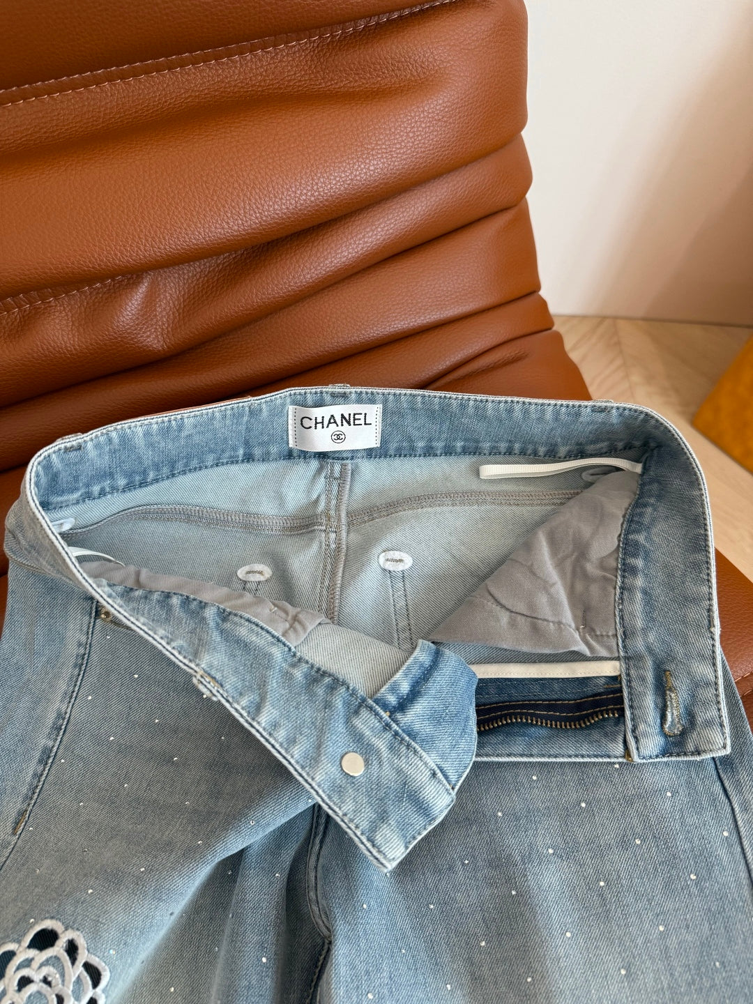 CC 25 Hollow Camellia Embroidery Jeans Light Blue Denim Cotton