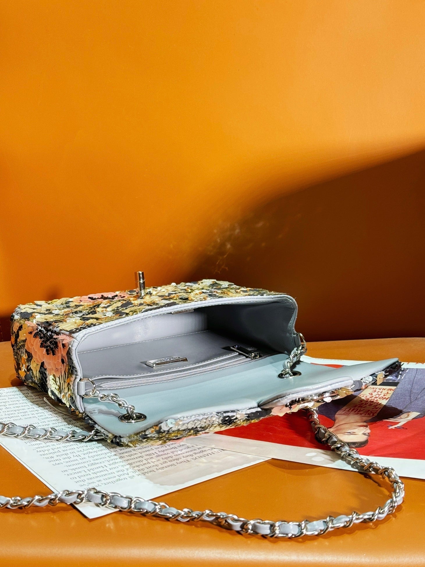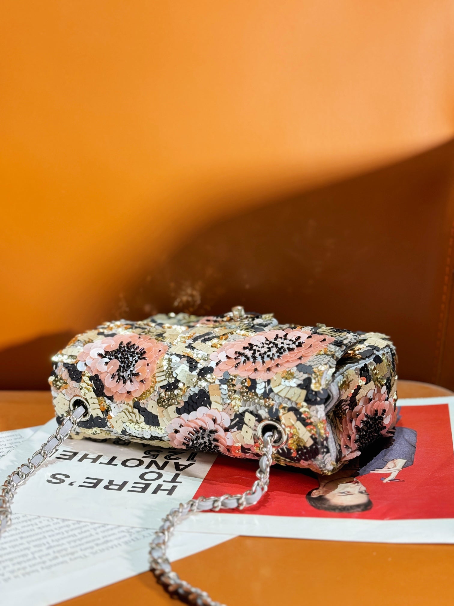 24S Flap Bag 20cm Multicolor Sequin Pink Flower Pearl Caflskin