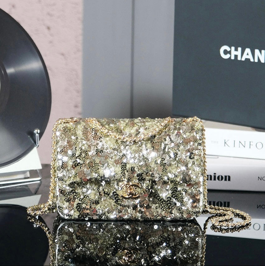 25C Flap Bag 21cm Dense Sequin White Calfskin