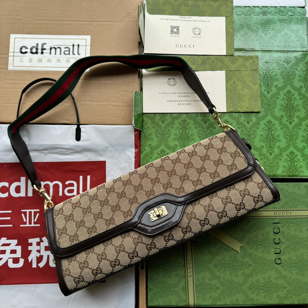 LUCE MEDIUM SHOULDER BAG 36 IN BEIGE CANVAS AND DARK BROWN CALFSKIN TRIM GOLD HARDWARE