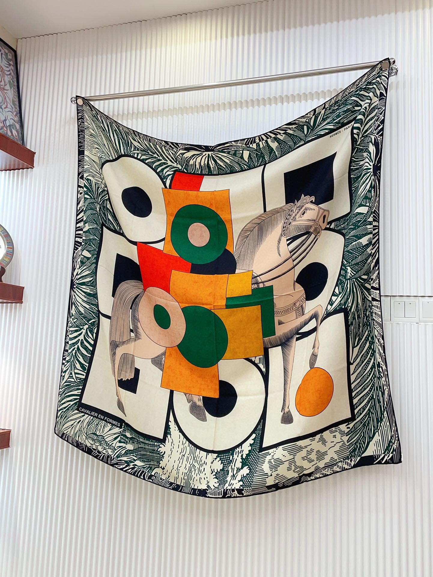 Cavalier en Formes shawl 140 CM In Duck Neck Blue Colorful Cashmere And Silk 331713