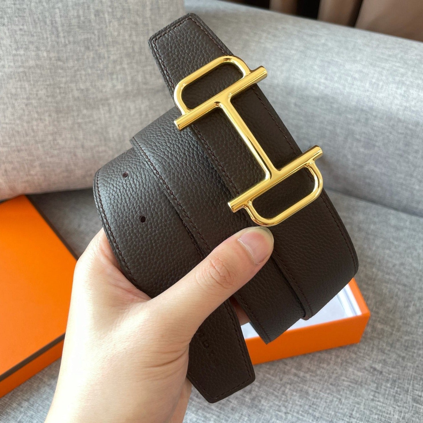• H Buckle in permabrass plated metal.