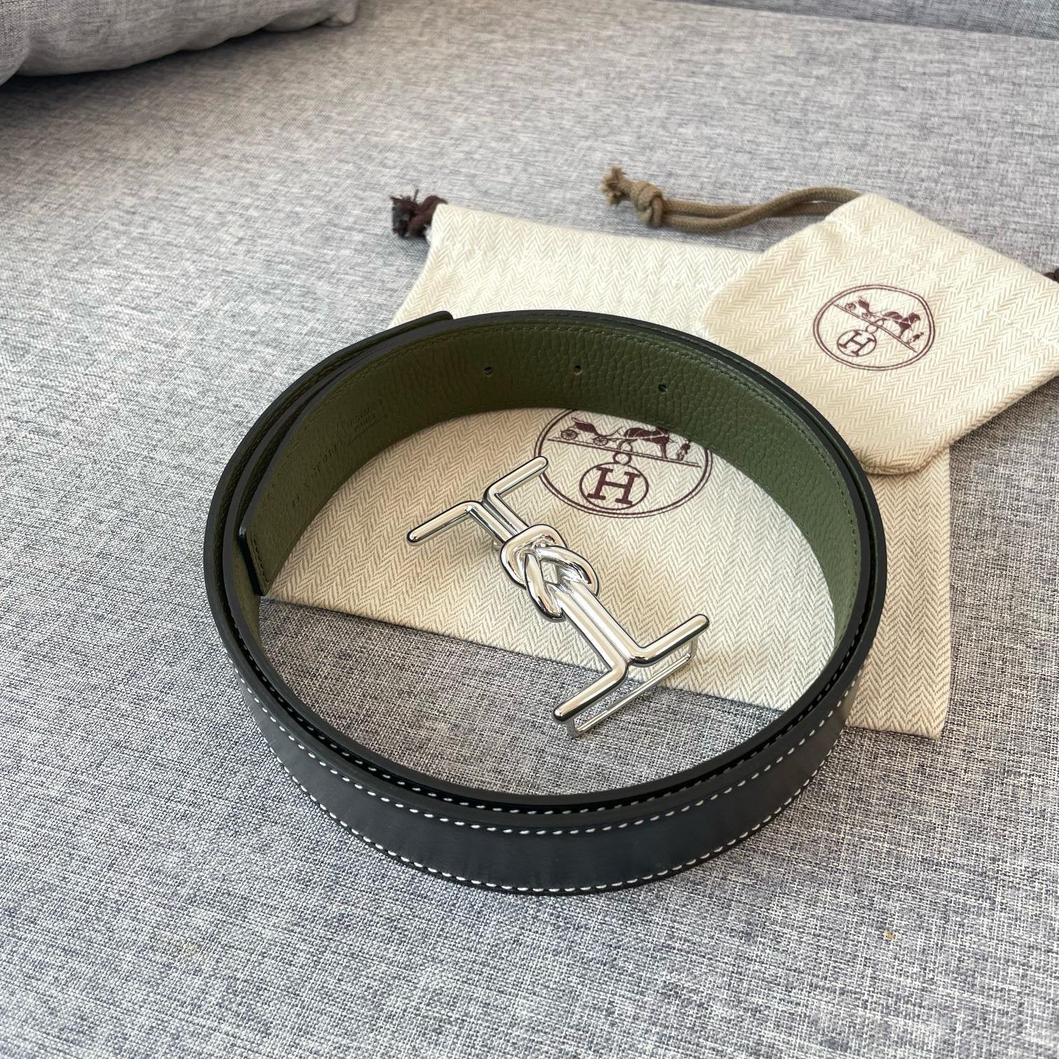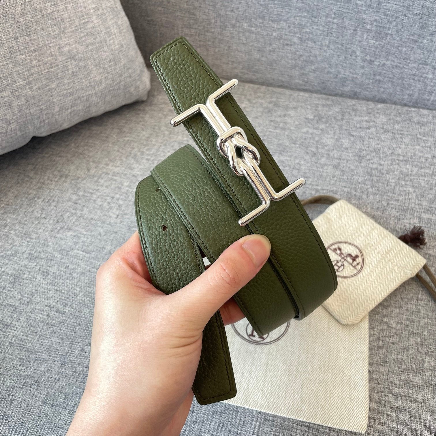 H MARIN REVERSIBLE BELT 32MM SILVER BUCKLE BLACK DARK GREEN LEATHER