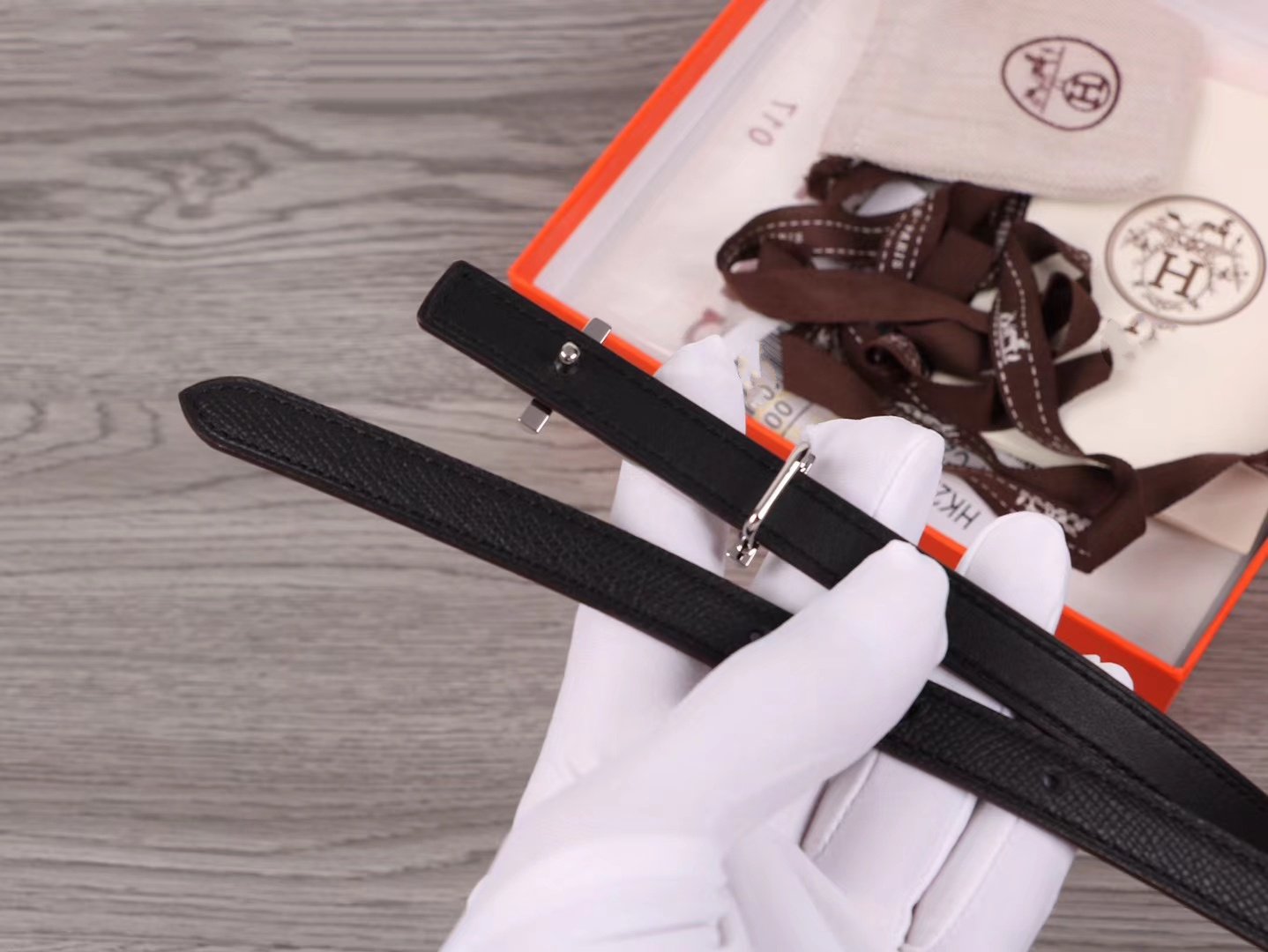 • H Buckle in permabrass plated metal.