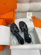 - Material: Sandal in Clafskin with straight cut edges, "H" cut-out detail and thin ankle strap.