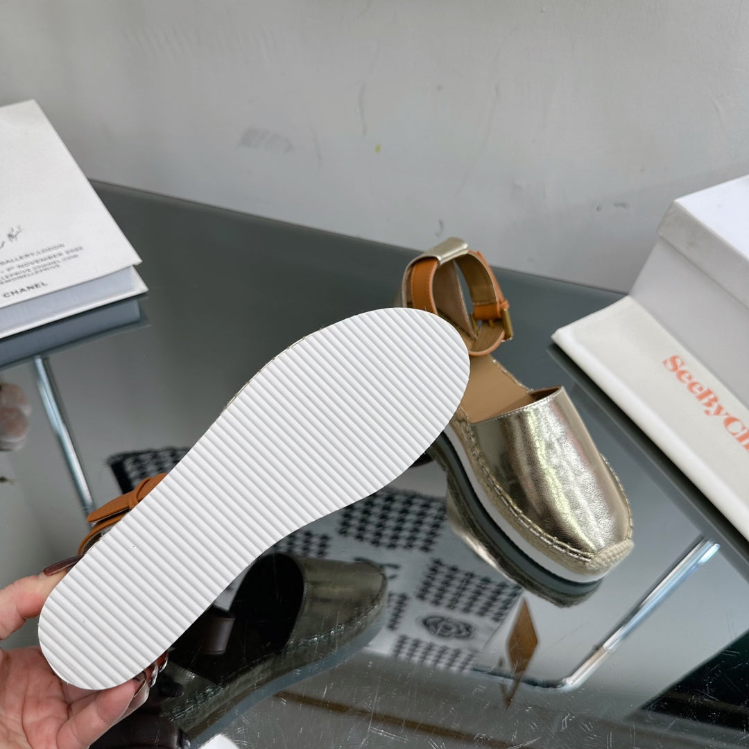 SEE BY CHLOÉ ESPADRILLES SANDAL IN LIGHT GOLD CALFSKIN AND WOVEN RAFFIA