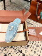 Loro Piana Blue Sky White Suede Charms Walk Flat Mules