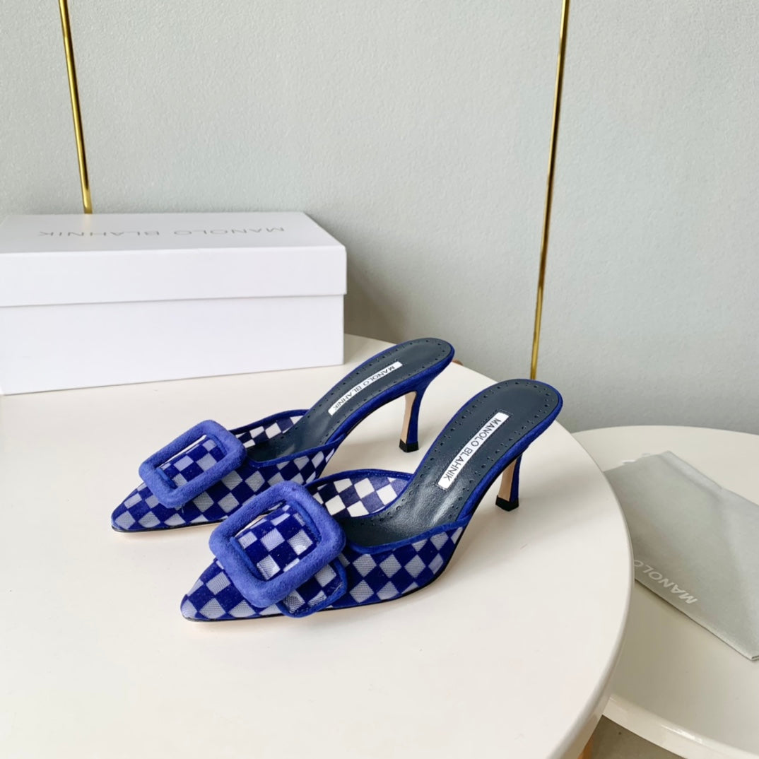 Manolo Mules Latest Checkerboard Blue Fabric Leather 528008
