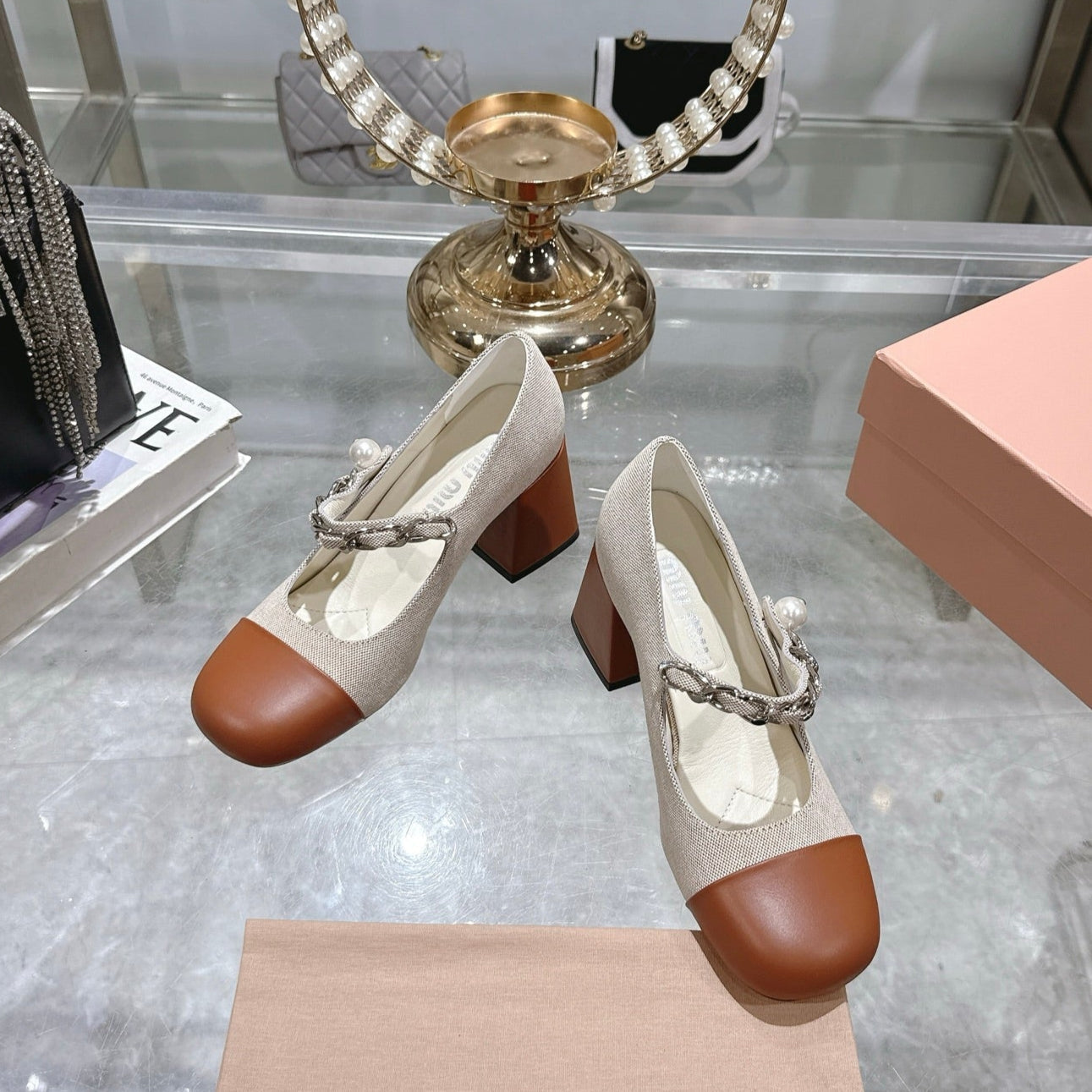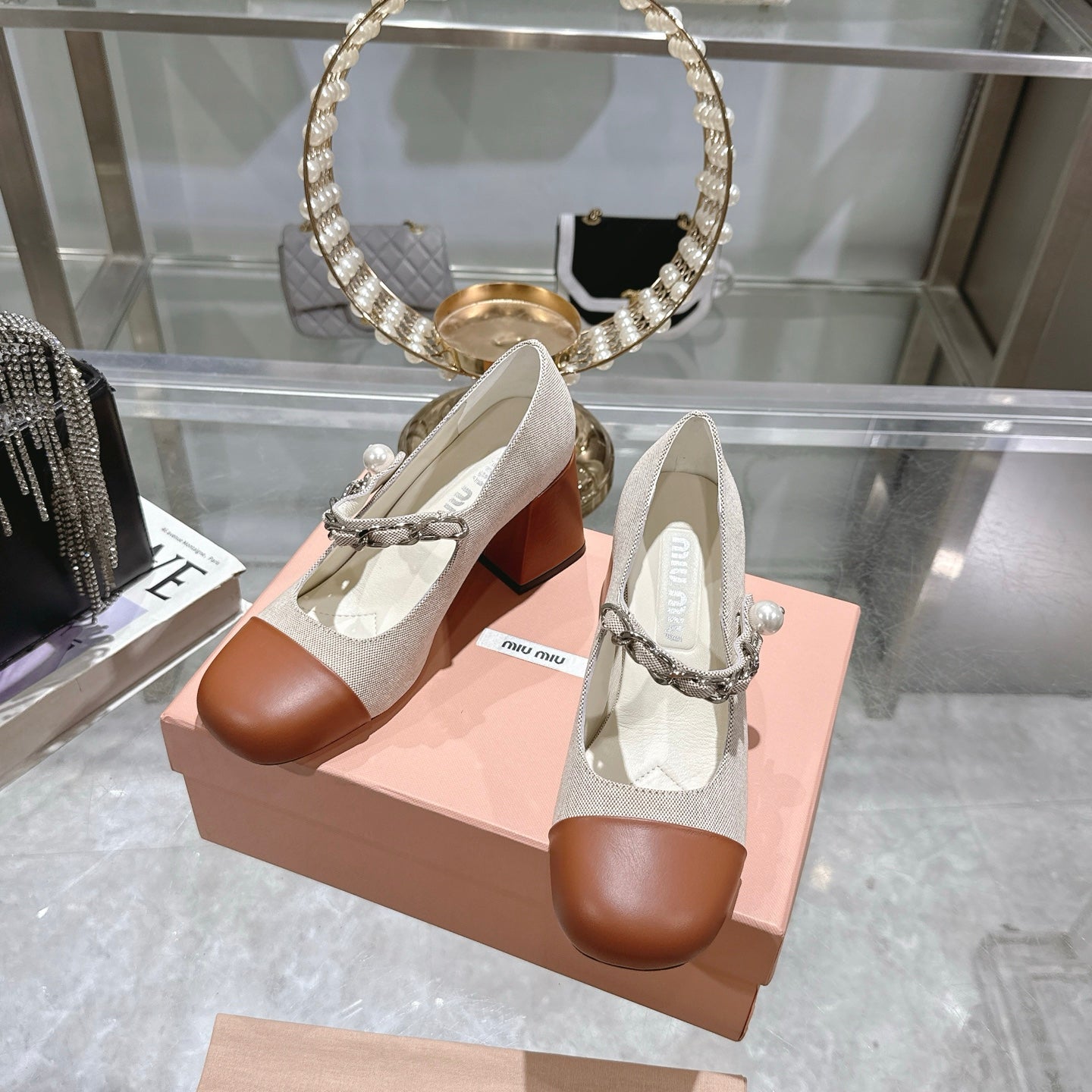 Miu 25C Mary Jane 75MM Beige Cream Mix Brown Fabric 235367