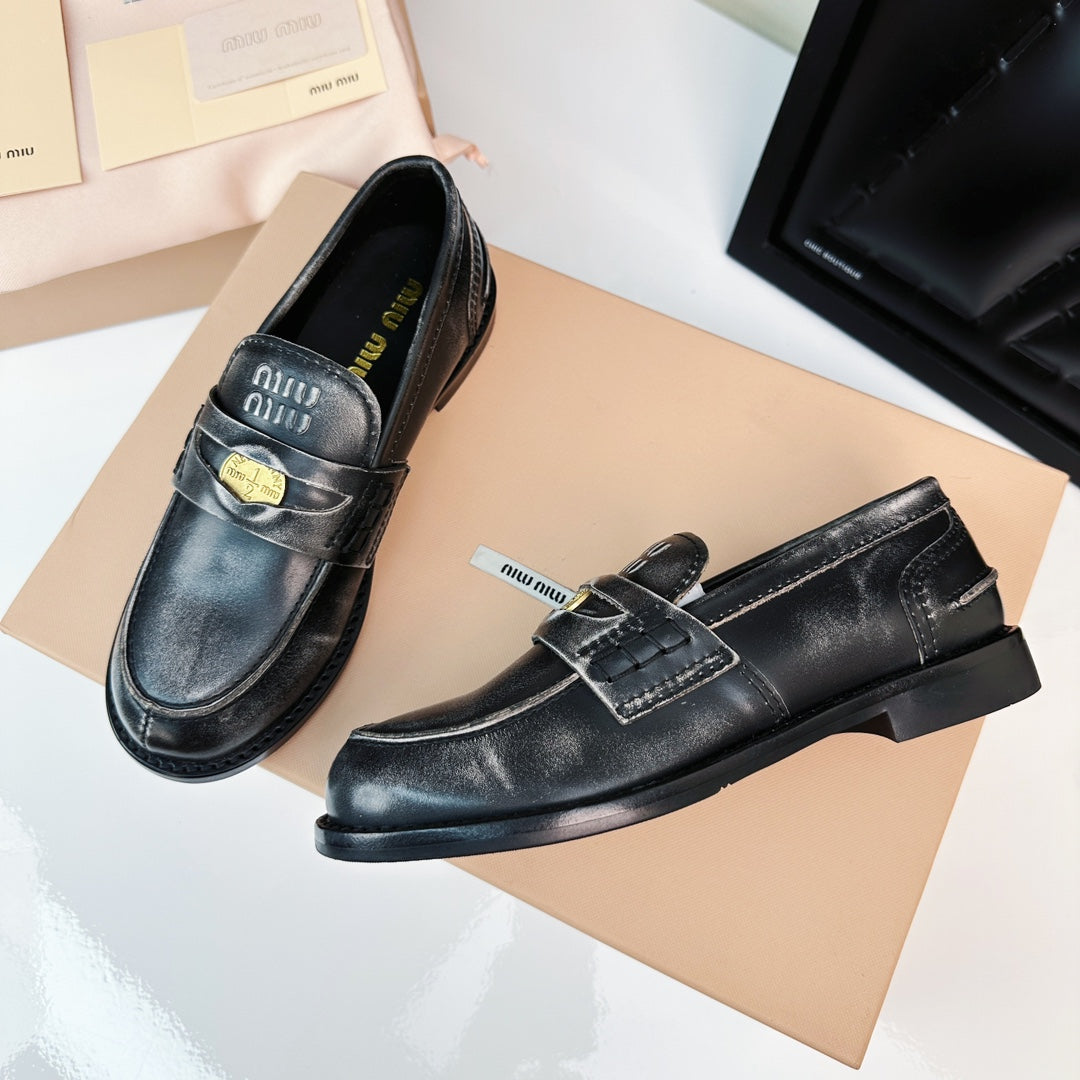Miu Loafers Coin Shaped Thick Sole Glossy Black Cowhide