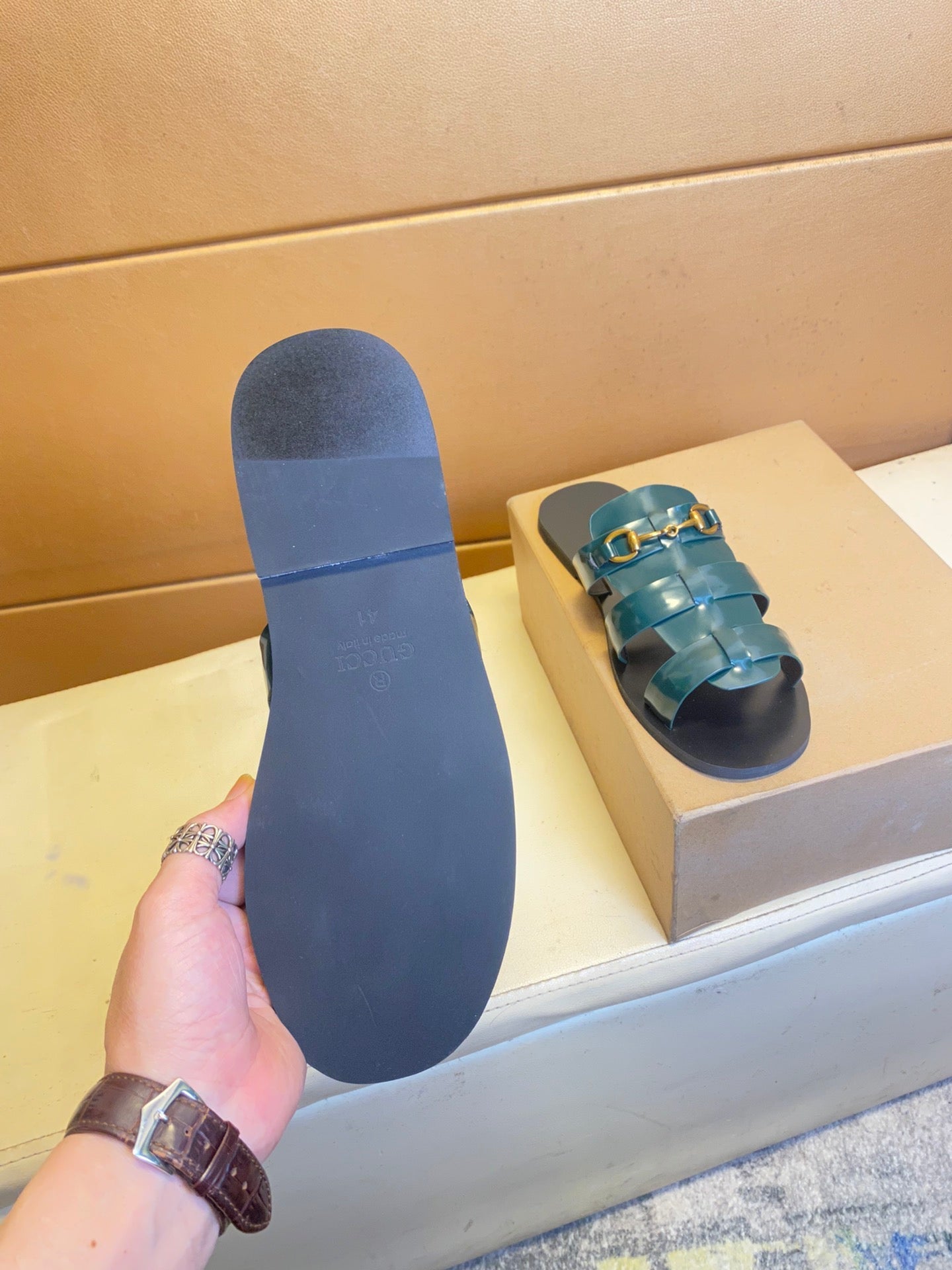 GG Men's Sandals Slide Black Green Cowhide