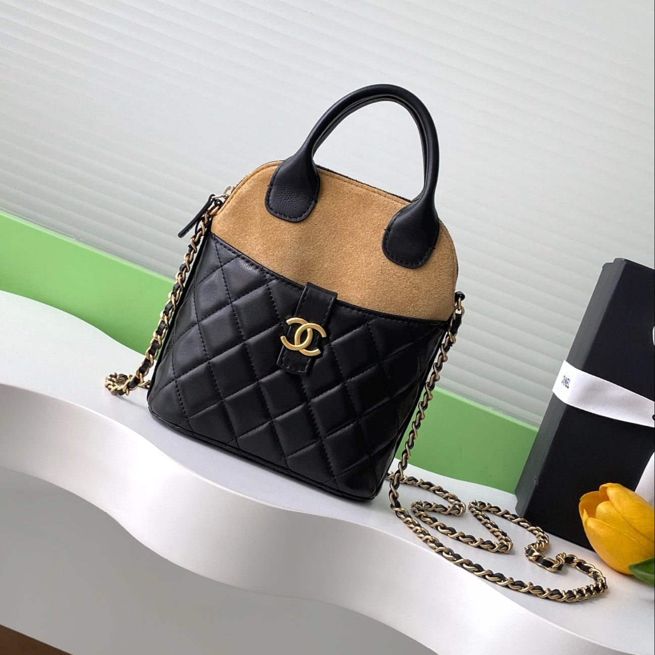 CC 25A Flap Bag 29cm Beige Suede Black Calfskin