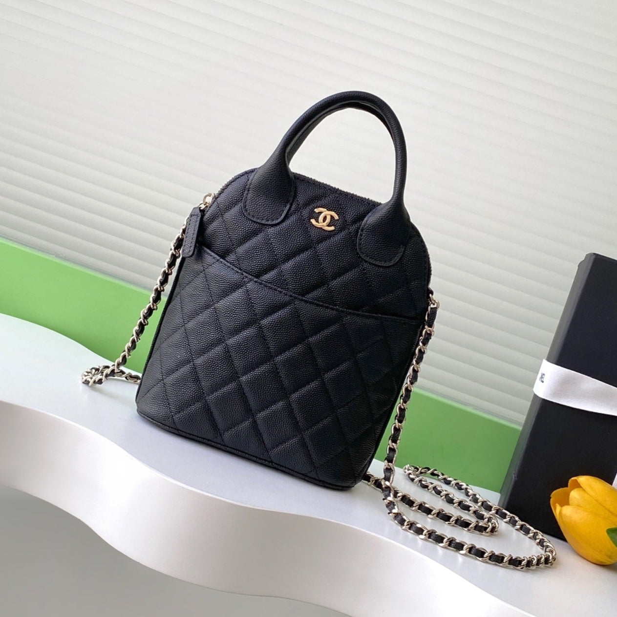 CC 25C Vanity Top Handle 21cm Black Grained Calfskin Light Gold Hardware
