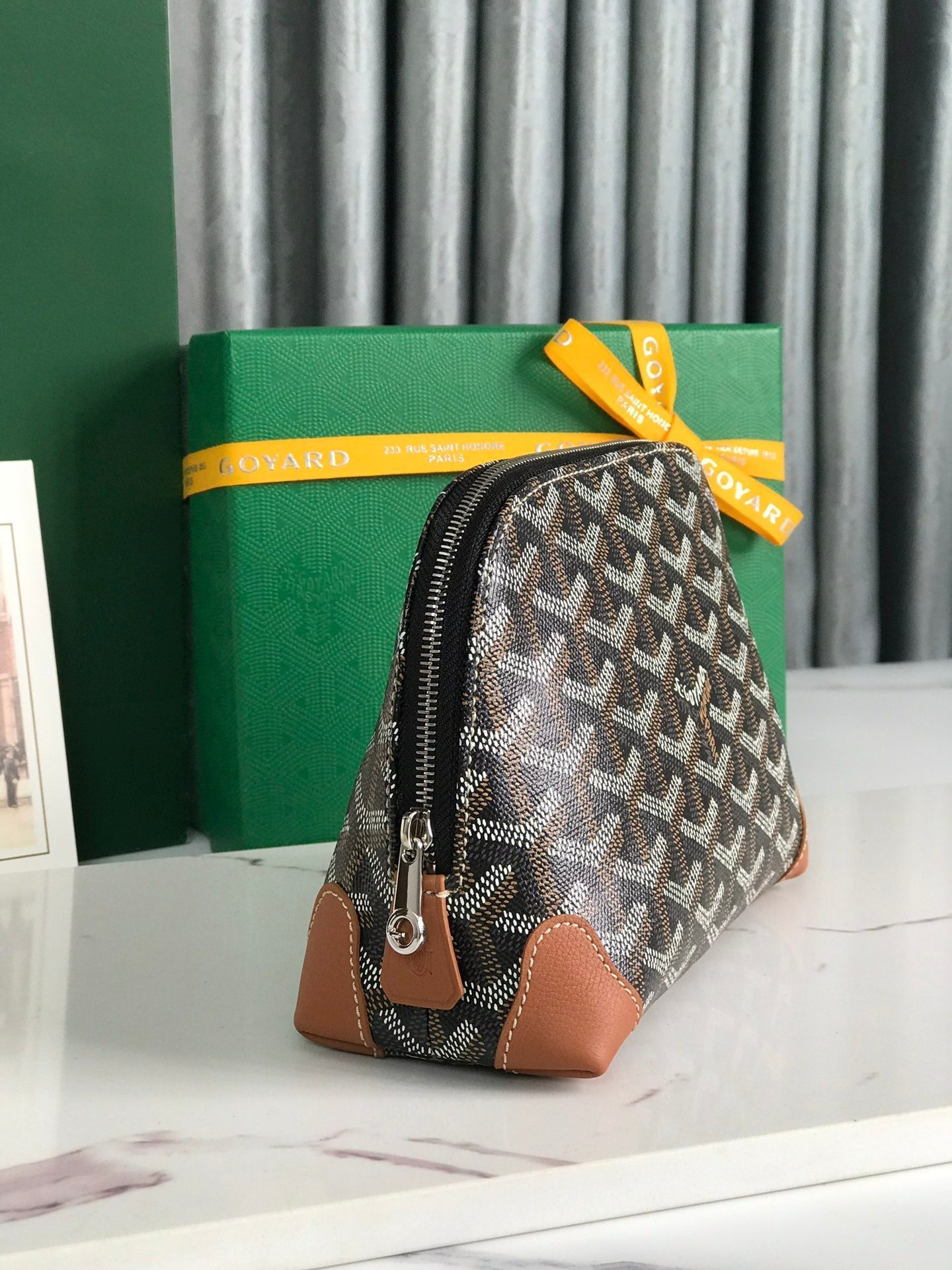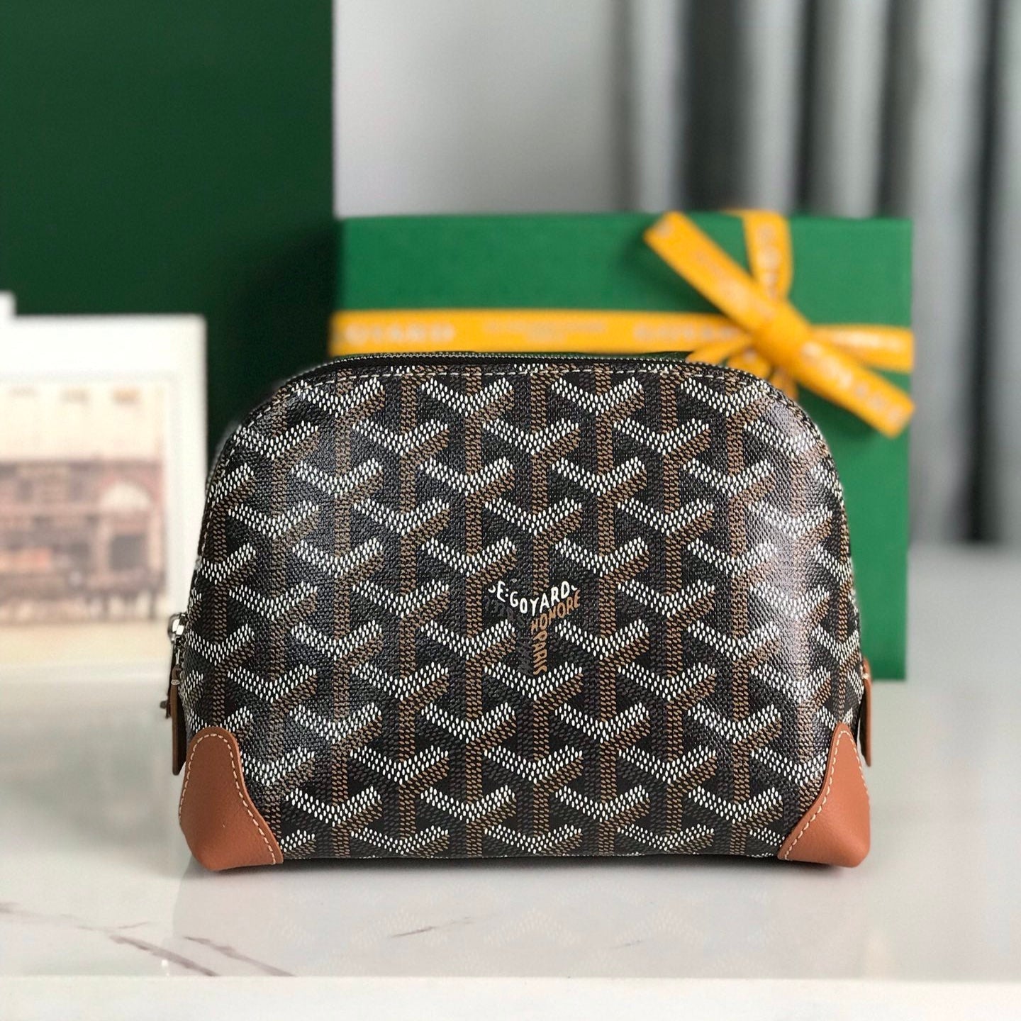 VENDÔME COSMETIC POUCH 17 IN BLACK GOYARDINE CANVAS AND TAN CALFSKIN TRIM