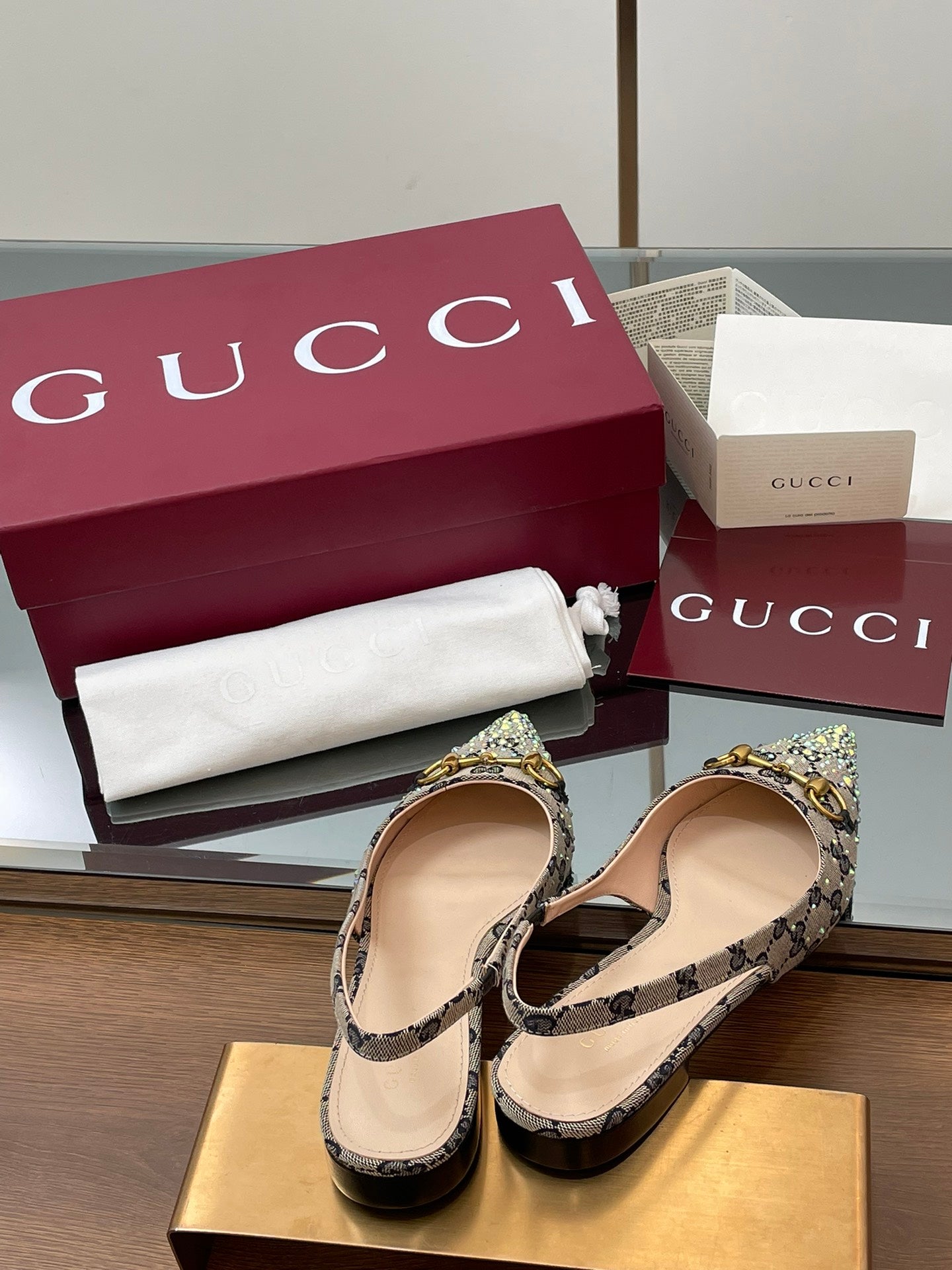 GG Horsebit Slingback Flat Black Ebony Monogram Canvas Point Toe Crystal-Embellished