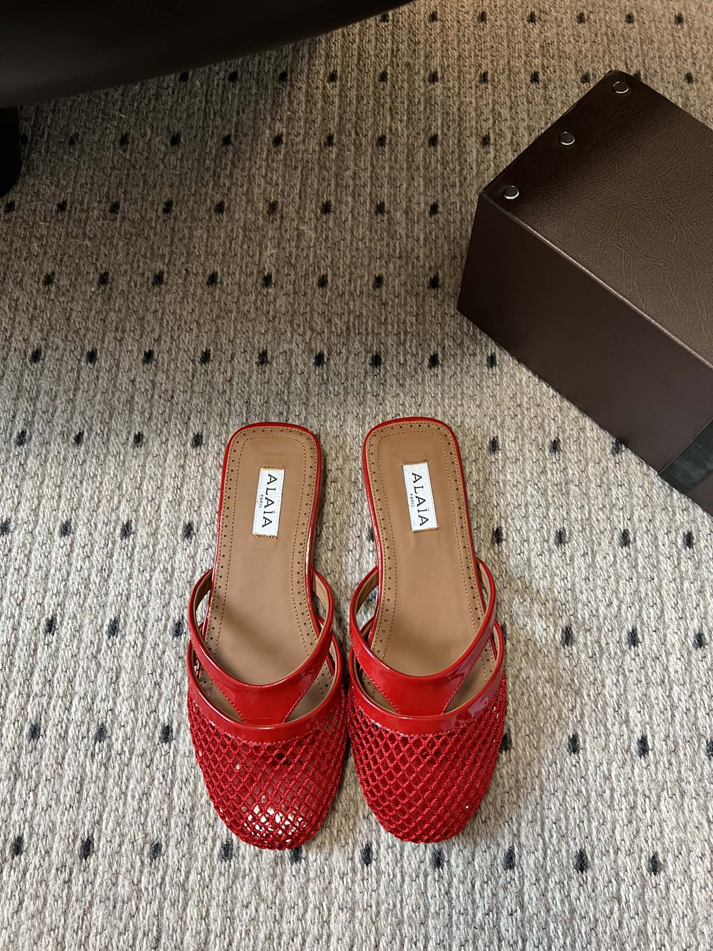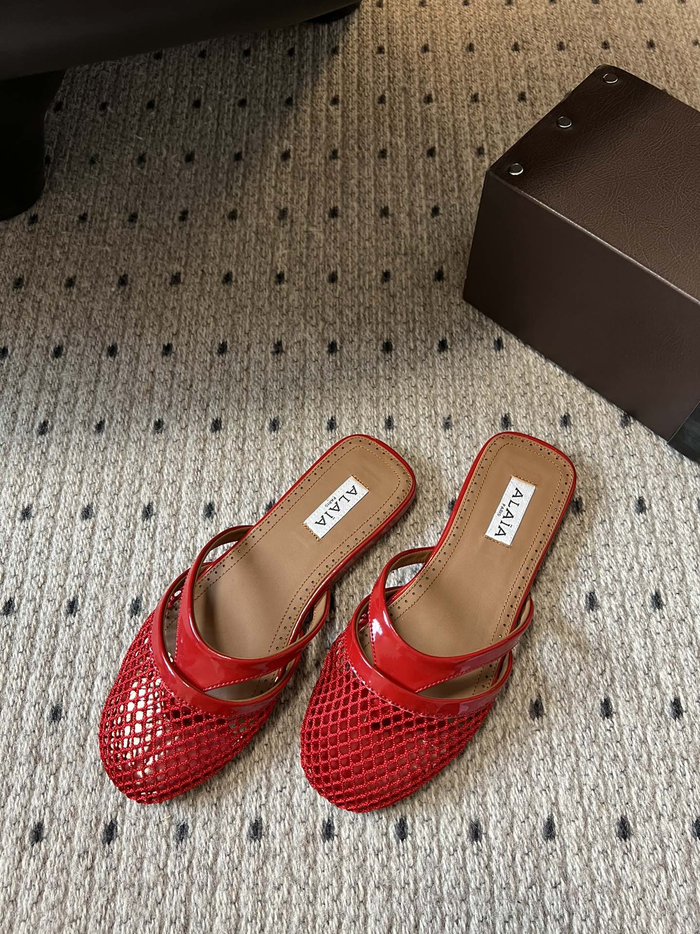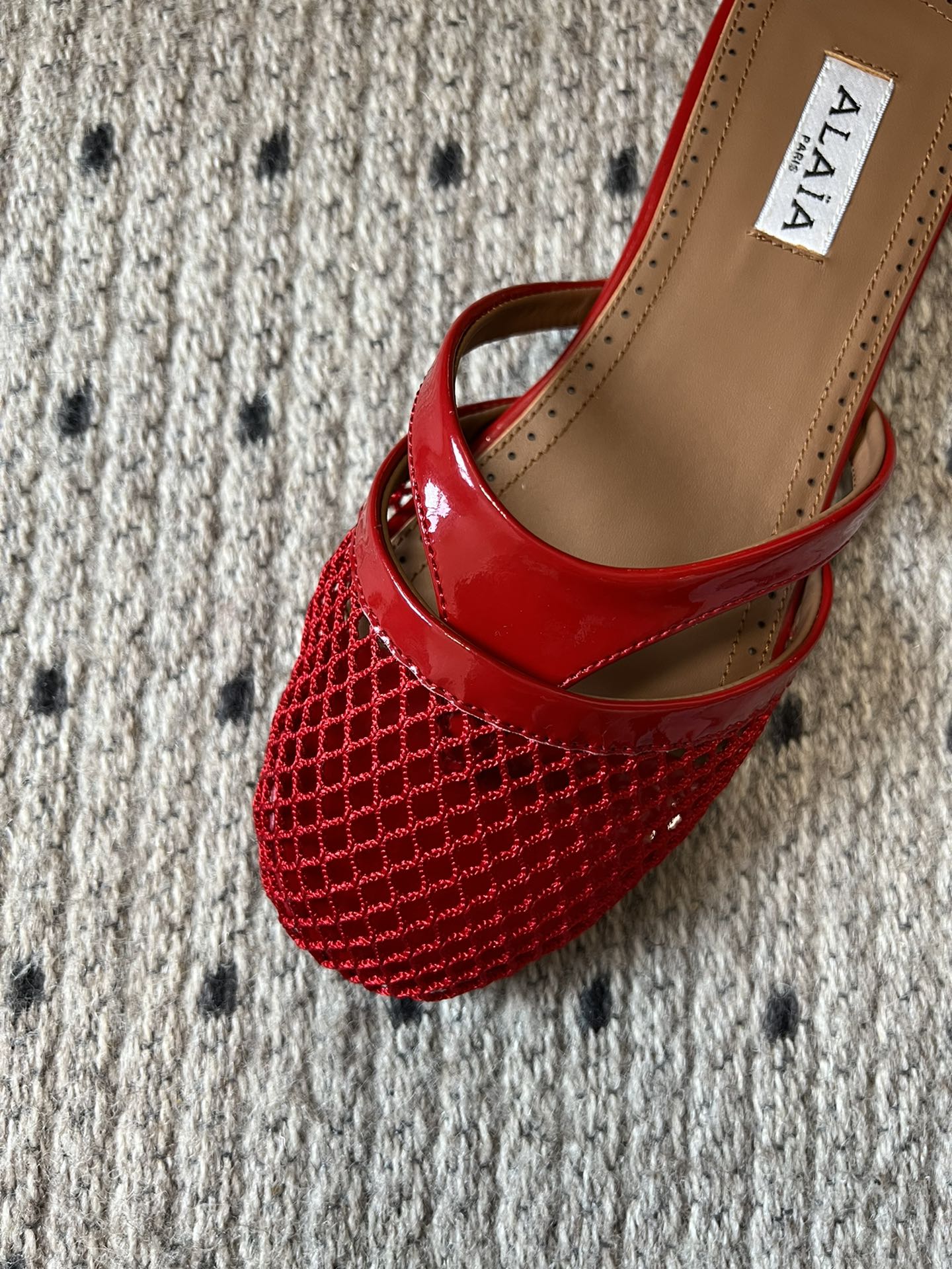 Alaia 25 Infradito Fishnet Flat Mules Red Lampskin 303710