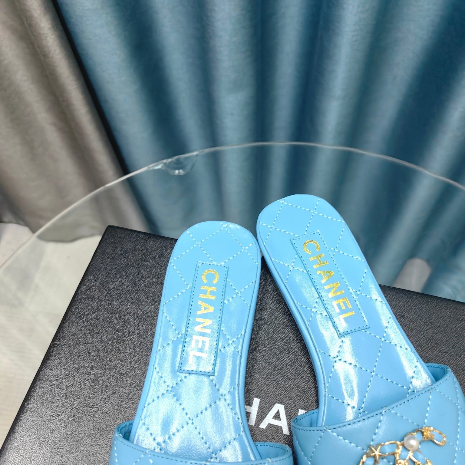 mule sandal quilted turquoise calfskin mop