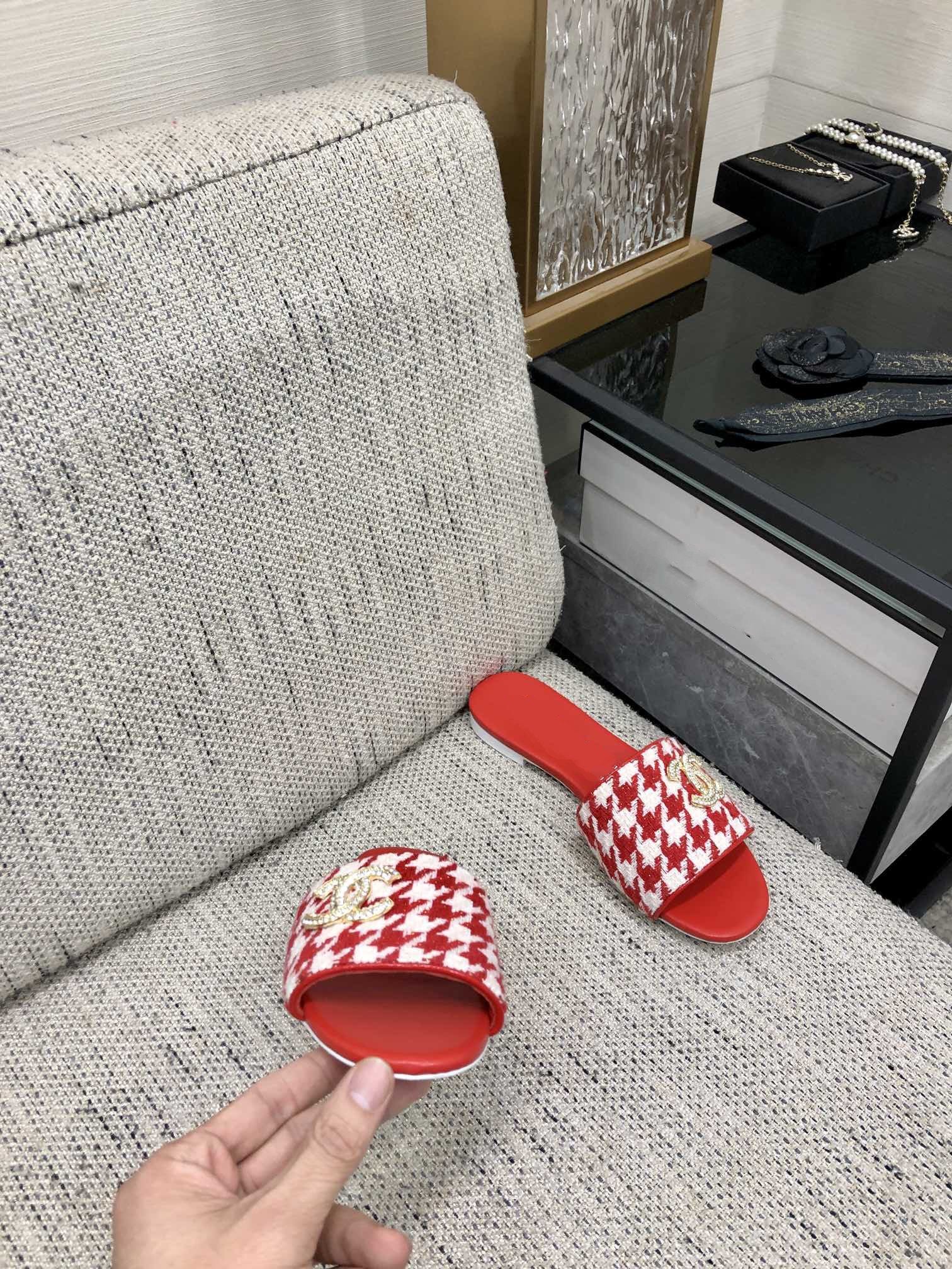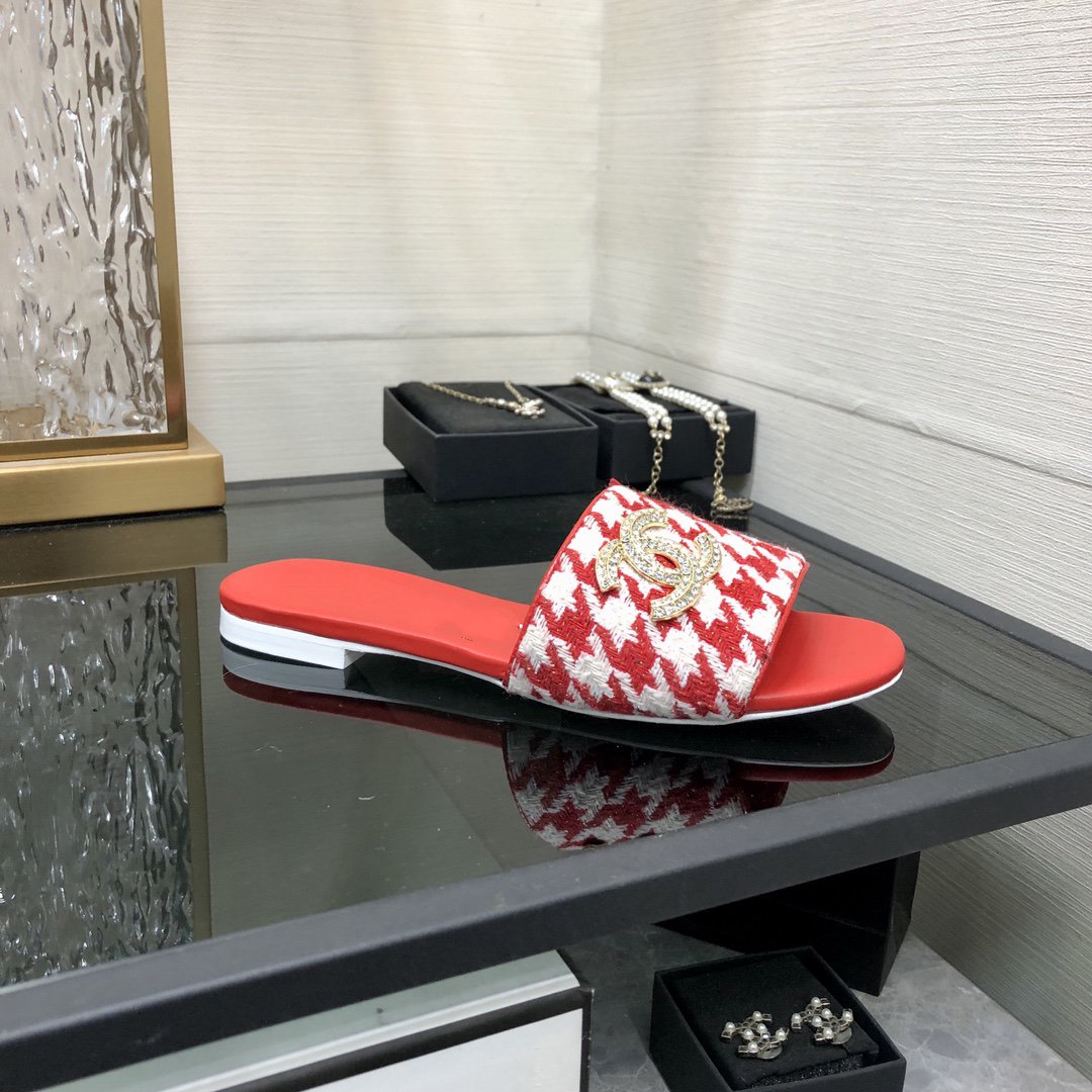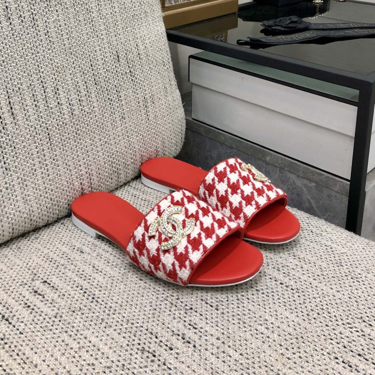 mule sandal red white houndstooth fabric
