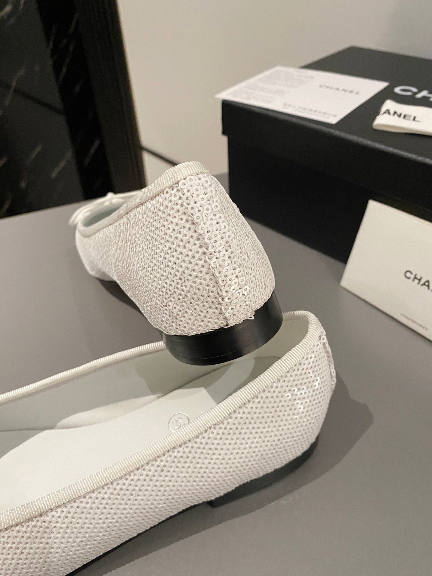 ballet flat white glitter sequins black grosgrain