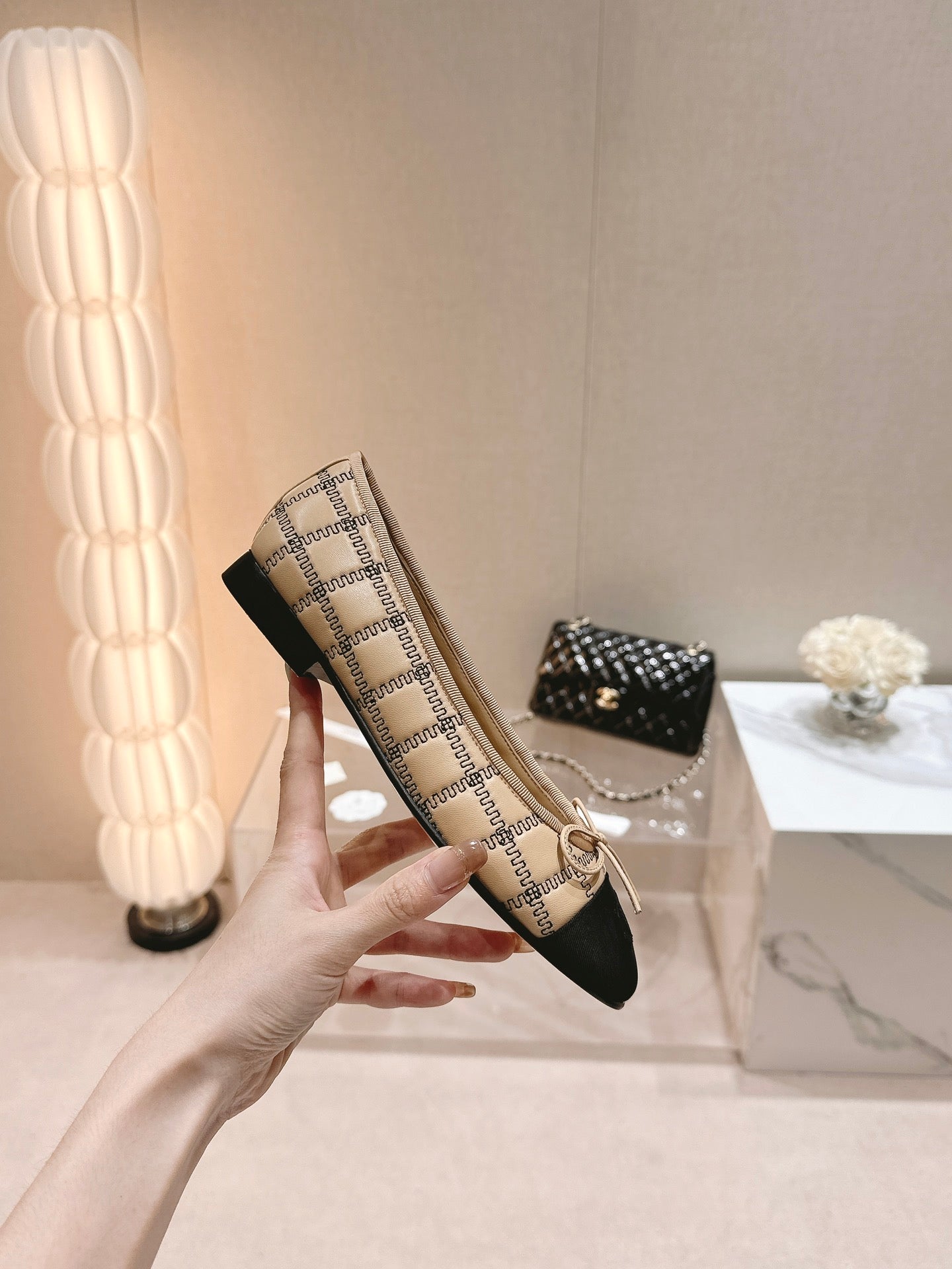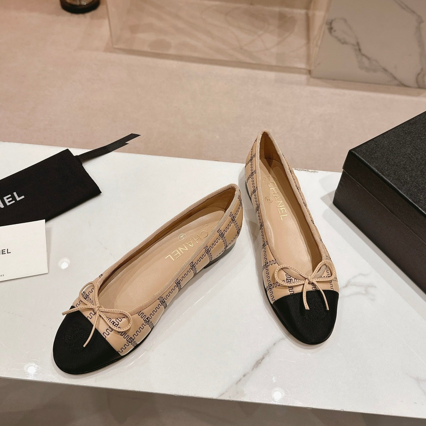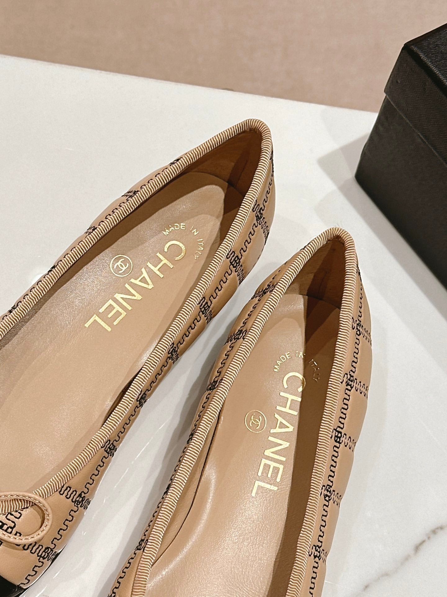 ballet flats beige black lambskin embroidery grosgrain