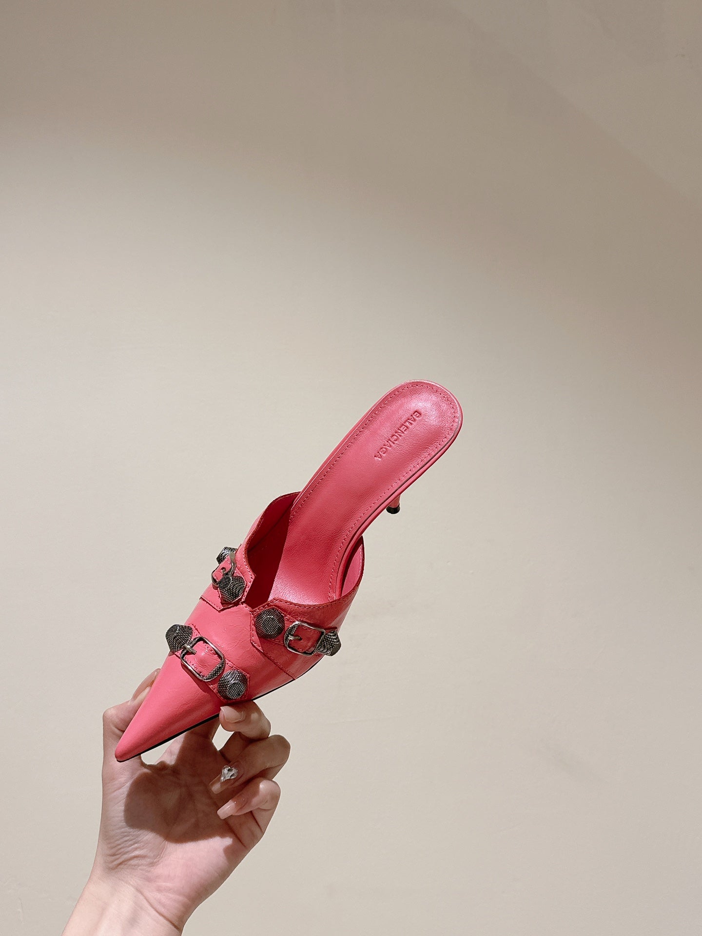 CAGOLE POINTED HIGH MULES IN ROMAN PINK SHINY CALFSKIN