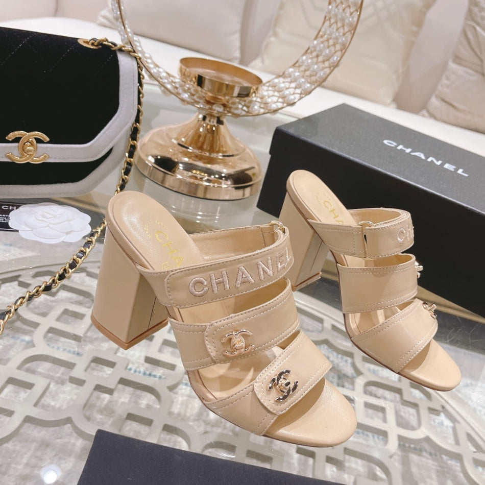 CC 25C Three Strap Sandal Mule High Heel Cream Sheepskin 213347