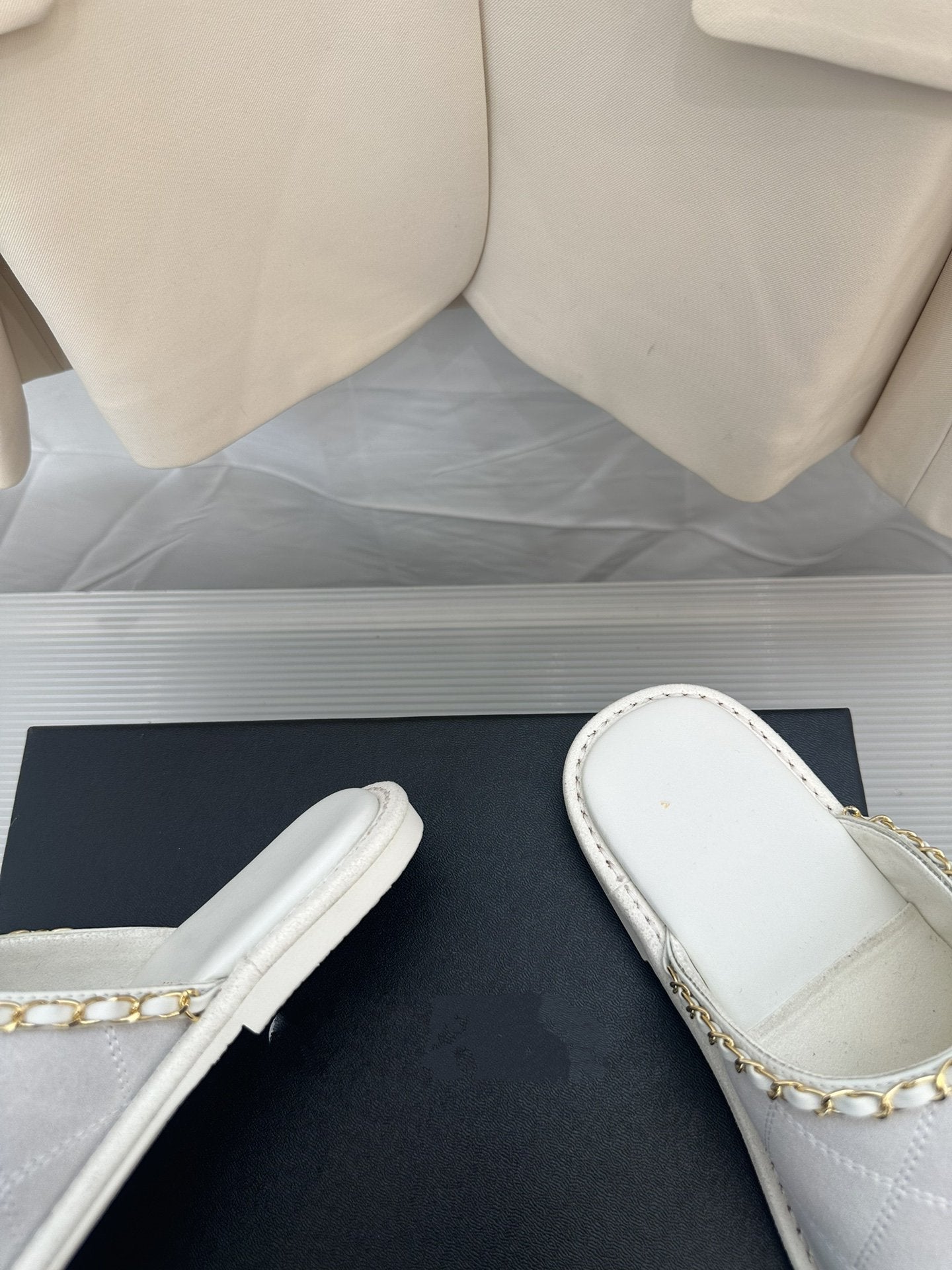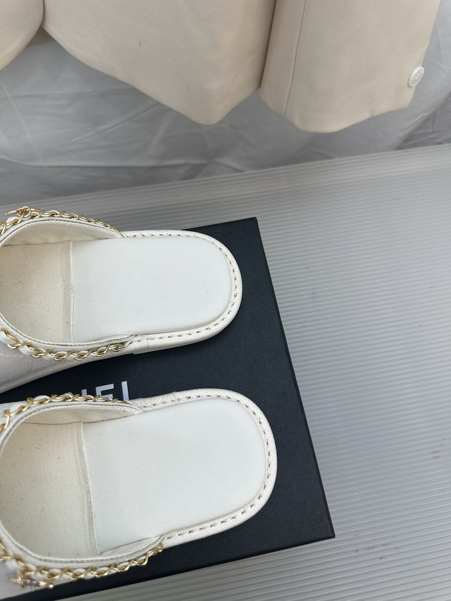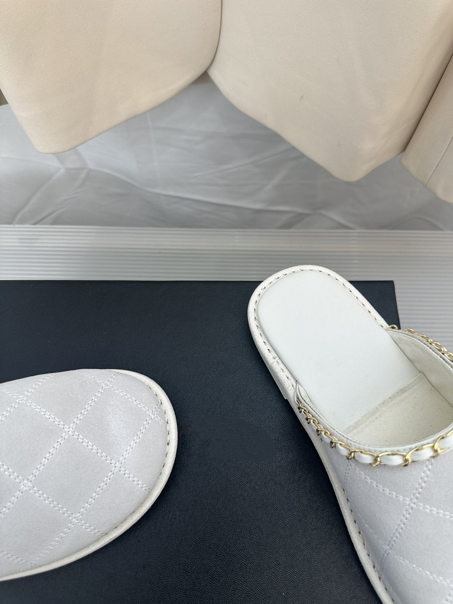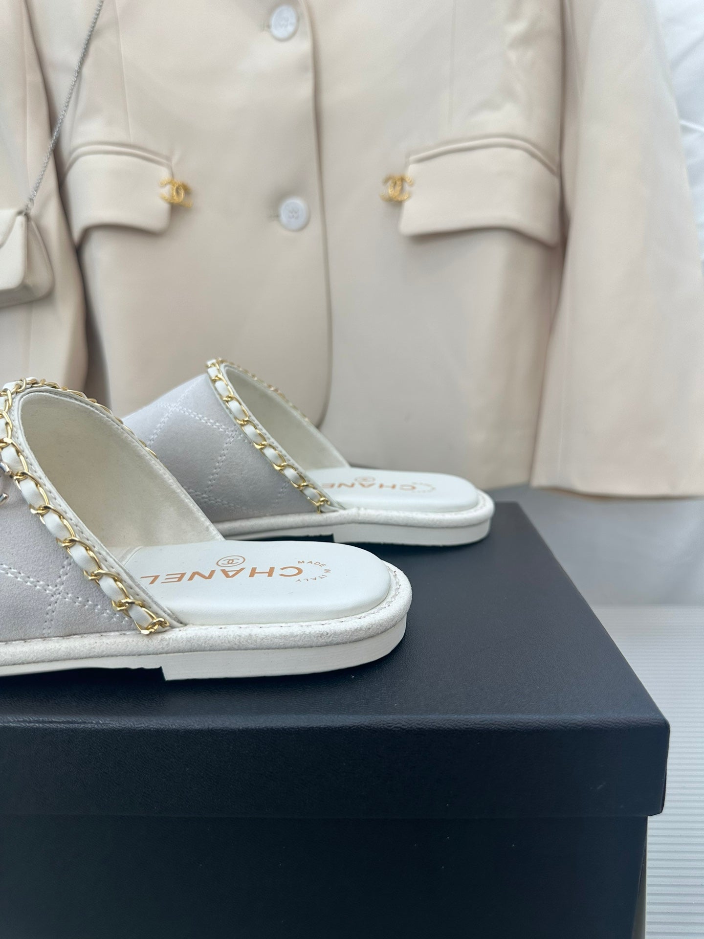 CC White Suede Gold Chain Mules