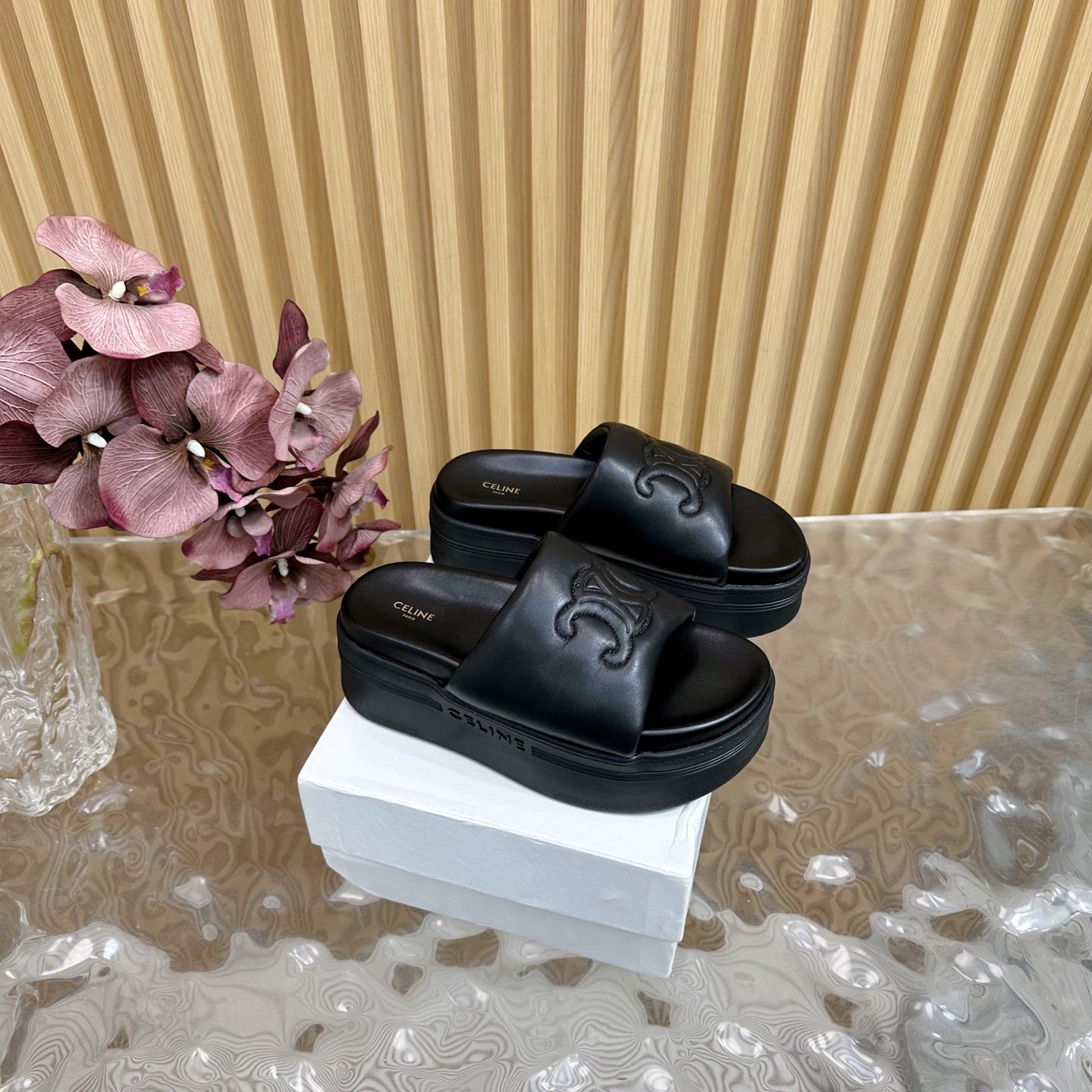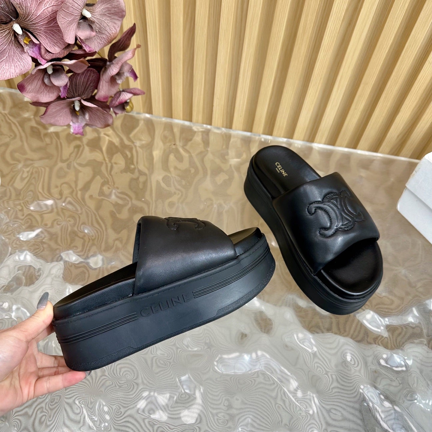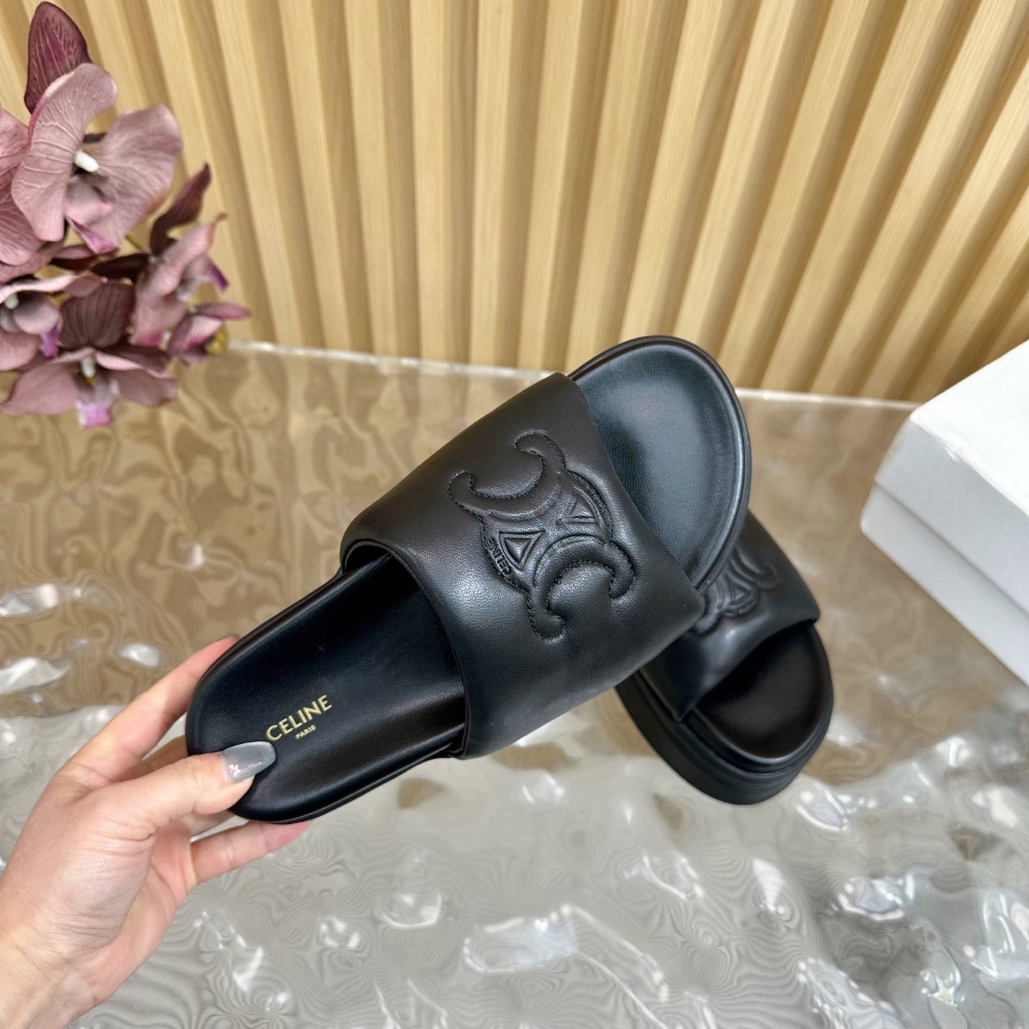 CELINE 25 Sline Sandal Black Sheepskin 285910