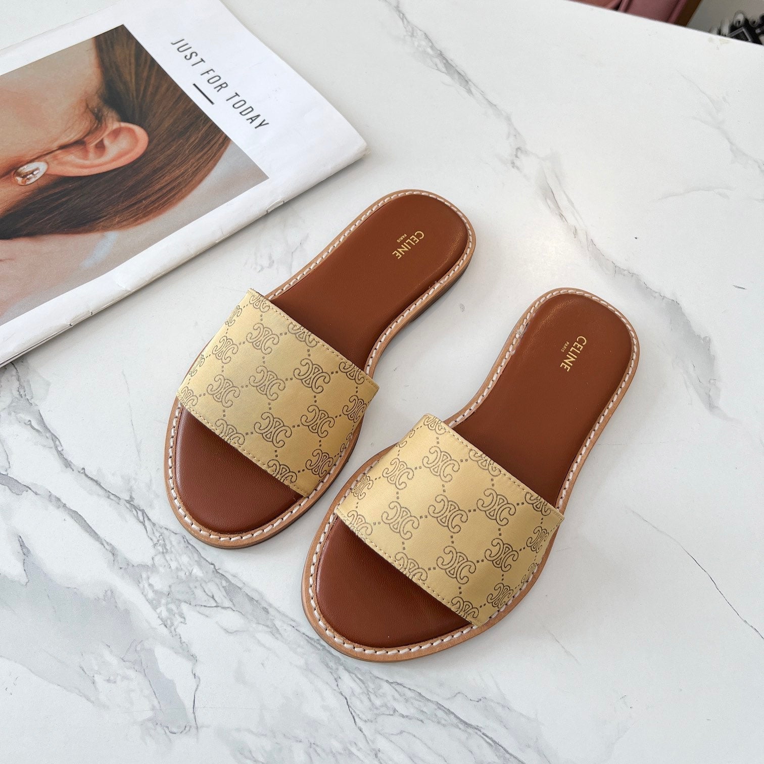 Celine 25C Slippers Egg Nog Monagram Silk with Calfskin 238148