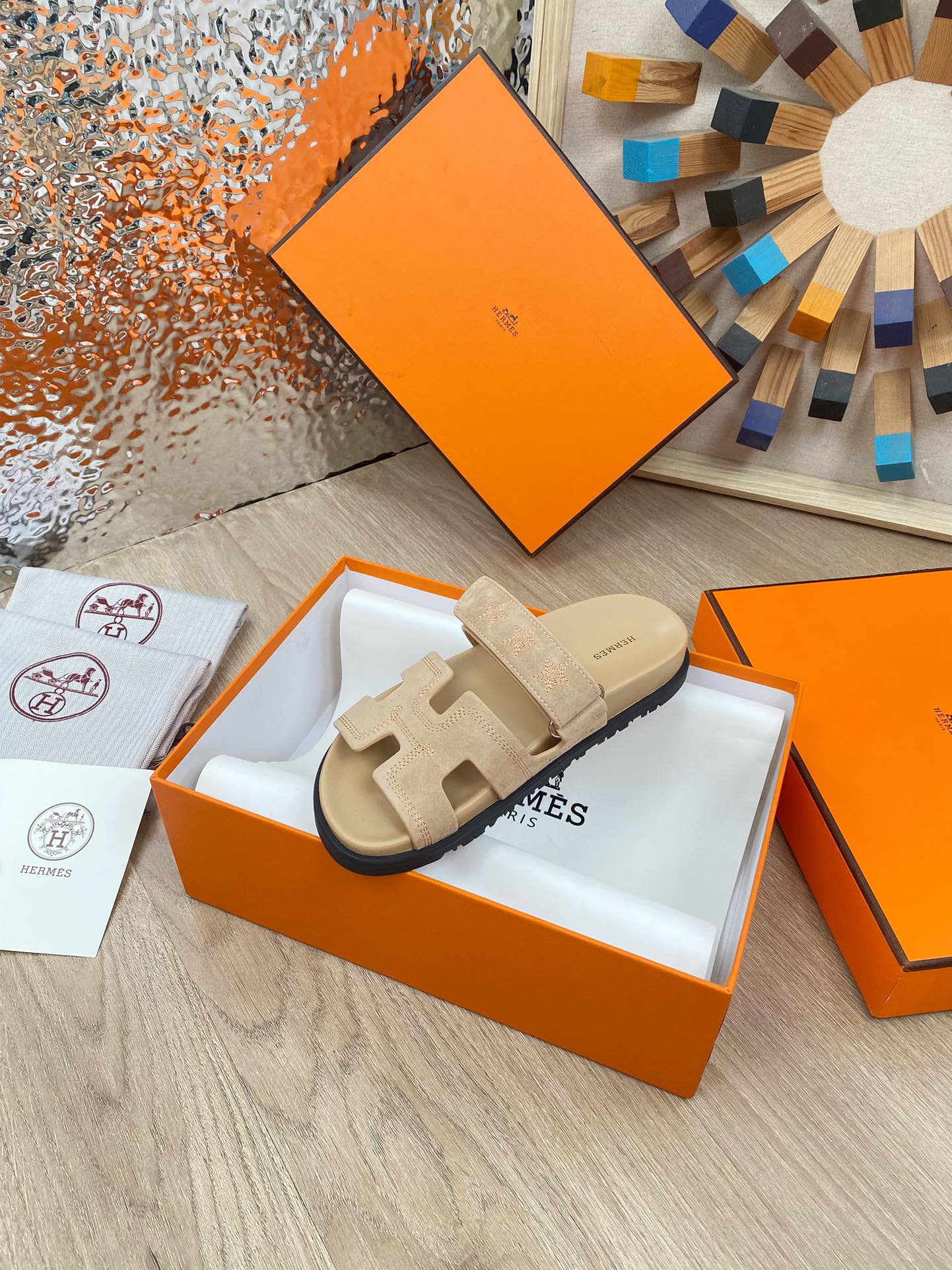 chypre sandal beige suede calfskin white thread embroidered
