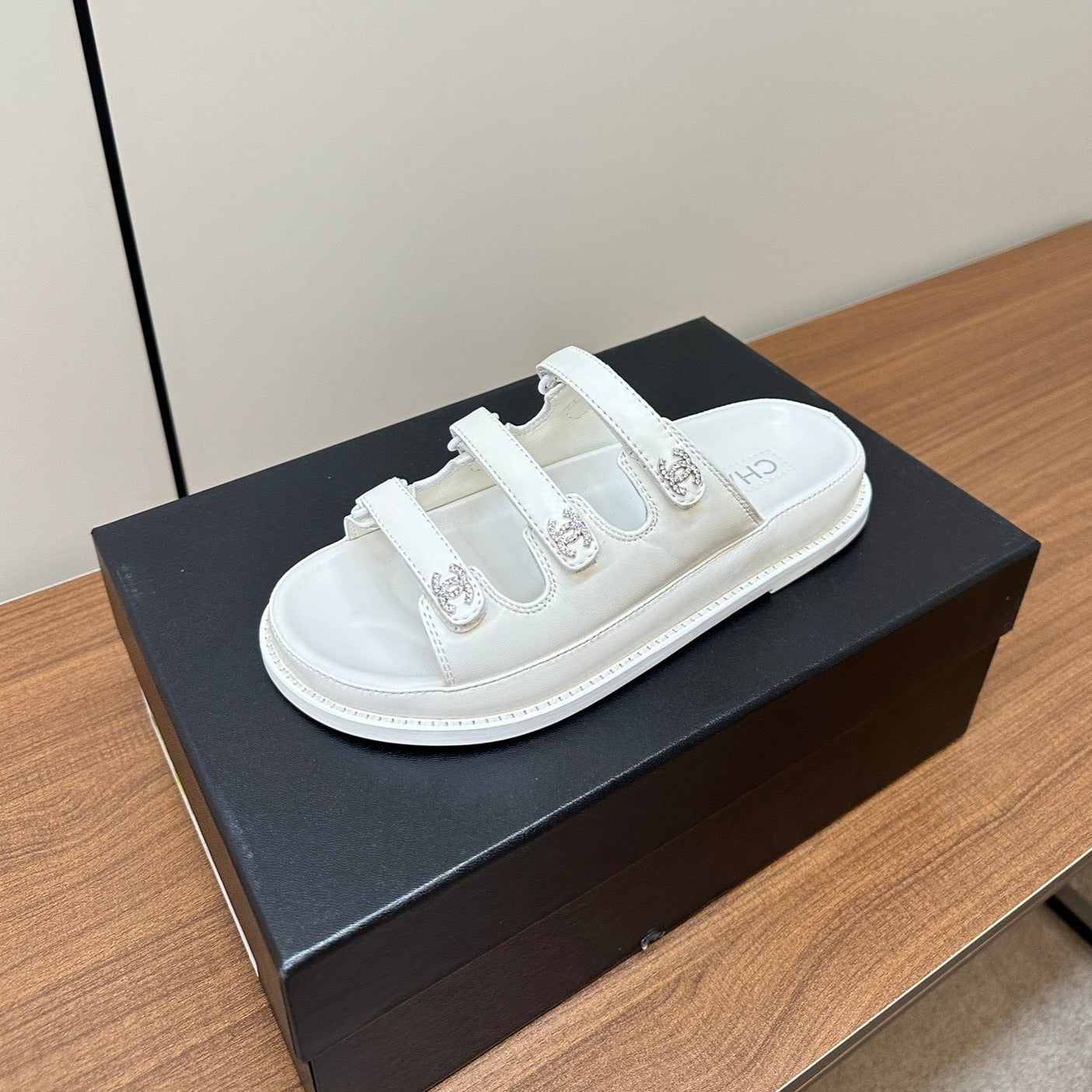 dad sandals white triple strap lambskin mules