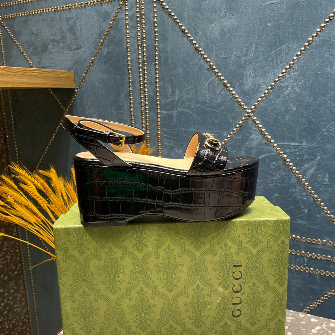 GG HORSEBIT FLATFORM SANDAL GLOSSY BLACK CALFSKIN