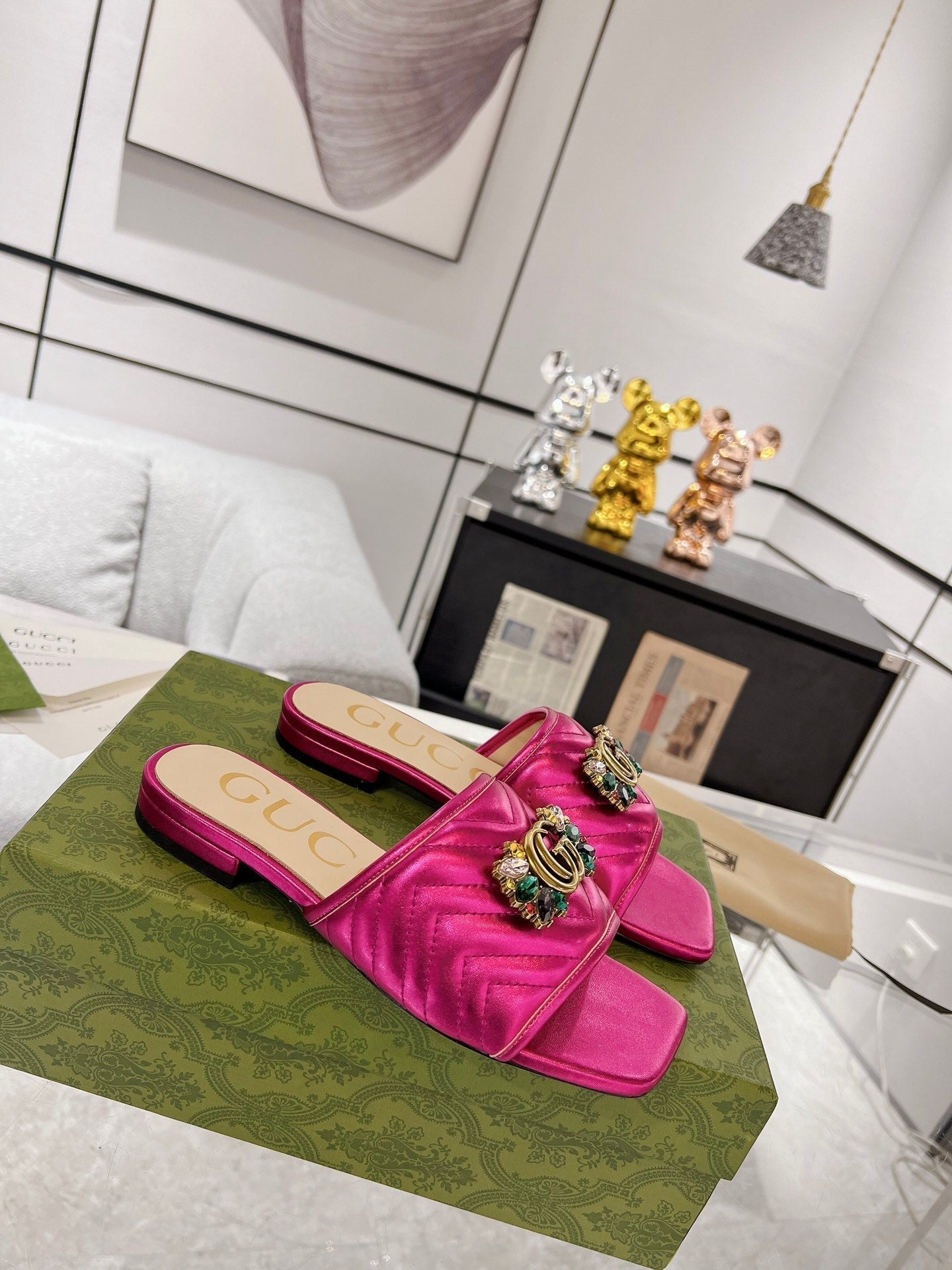 GG SPARKLE CRYSTAL SLIDE SANDAL METALLIC PINK CALFSKIN