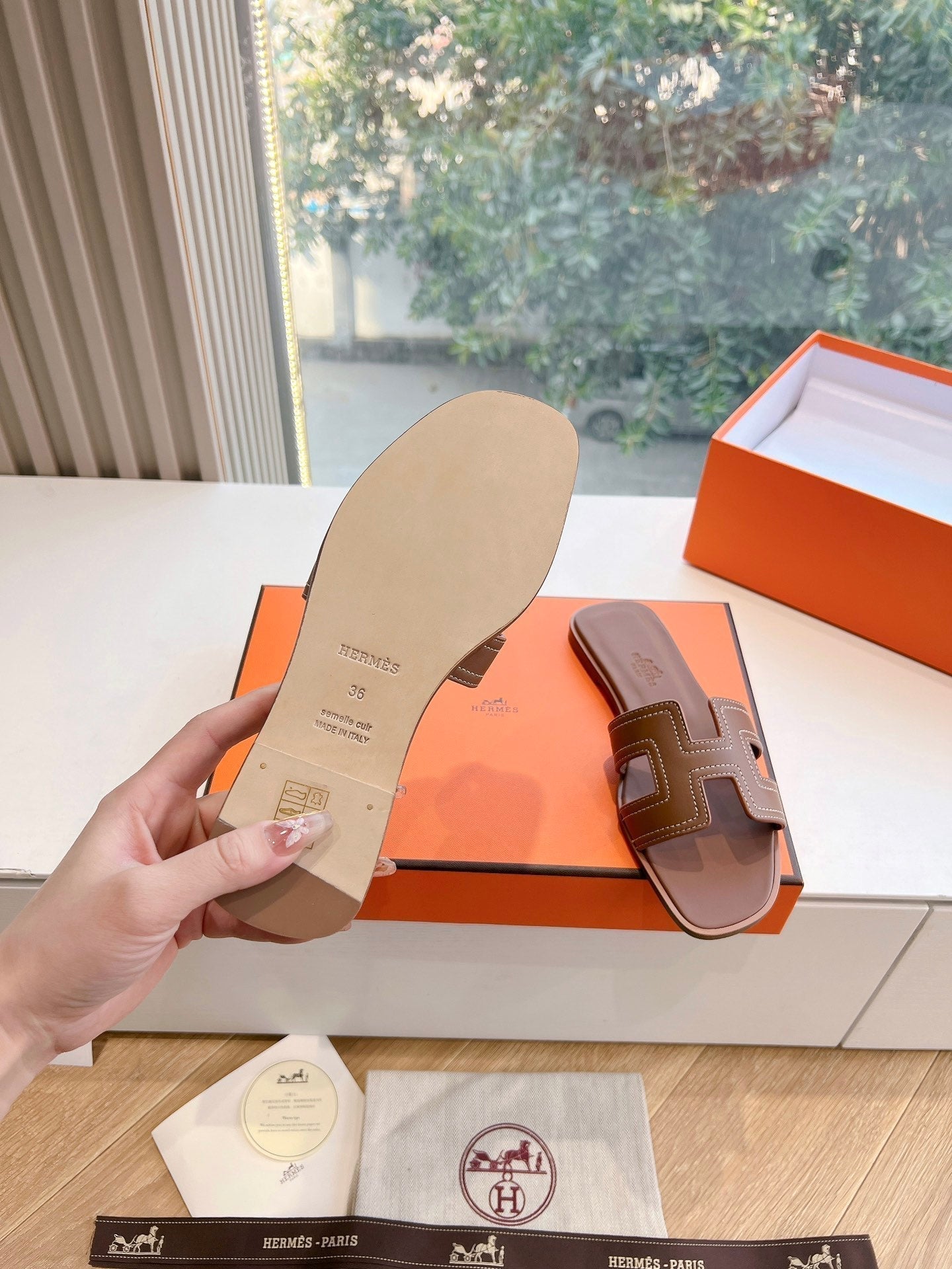 HM 25 Oran Sandal Brown Calfskin White Thread Embroidery