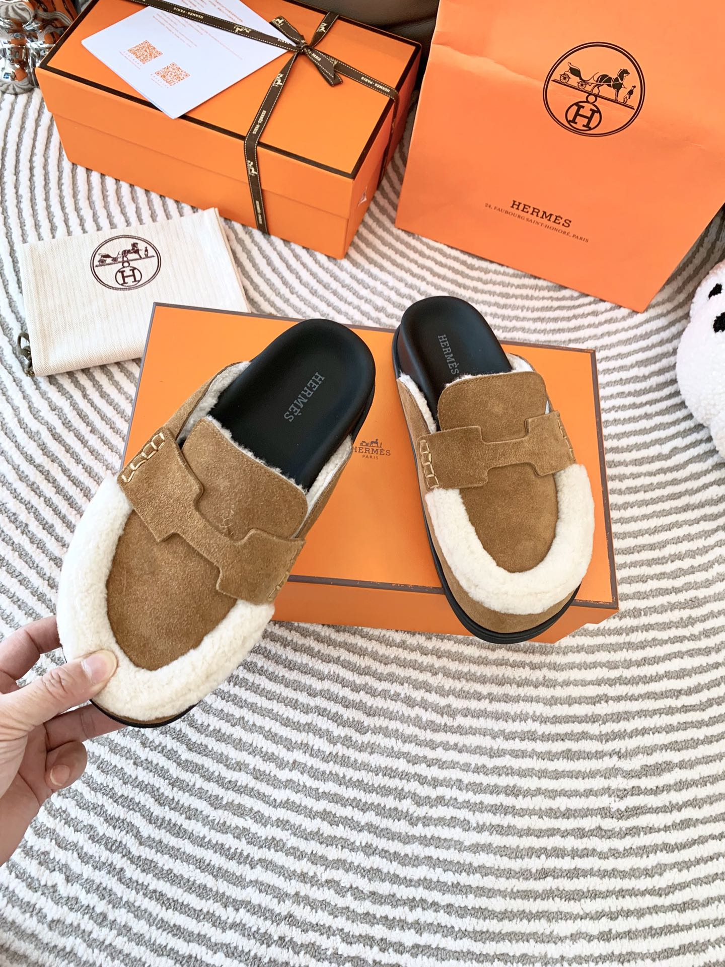 HM Go Mule Brown Mix White Suede Lined With Wool Fleece 963222