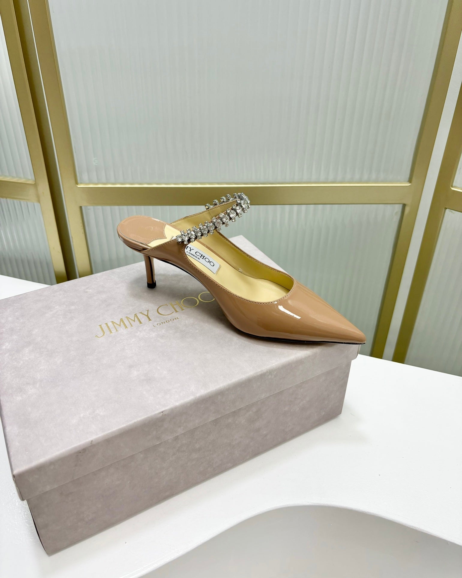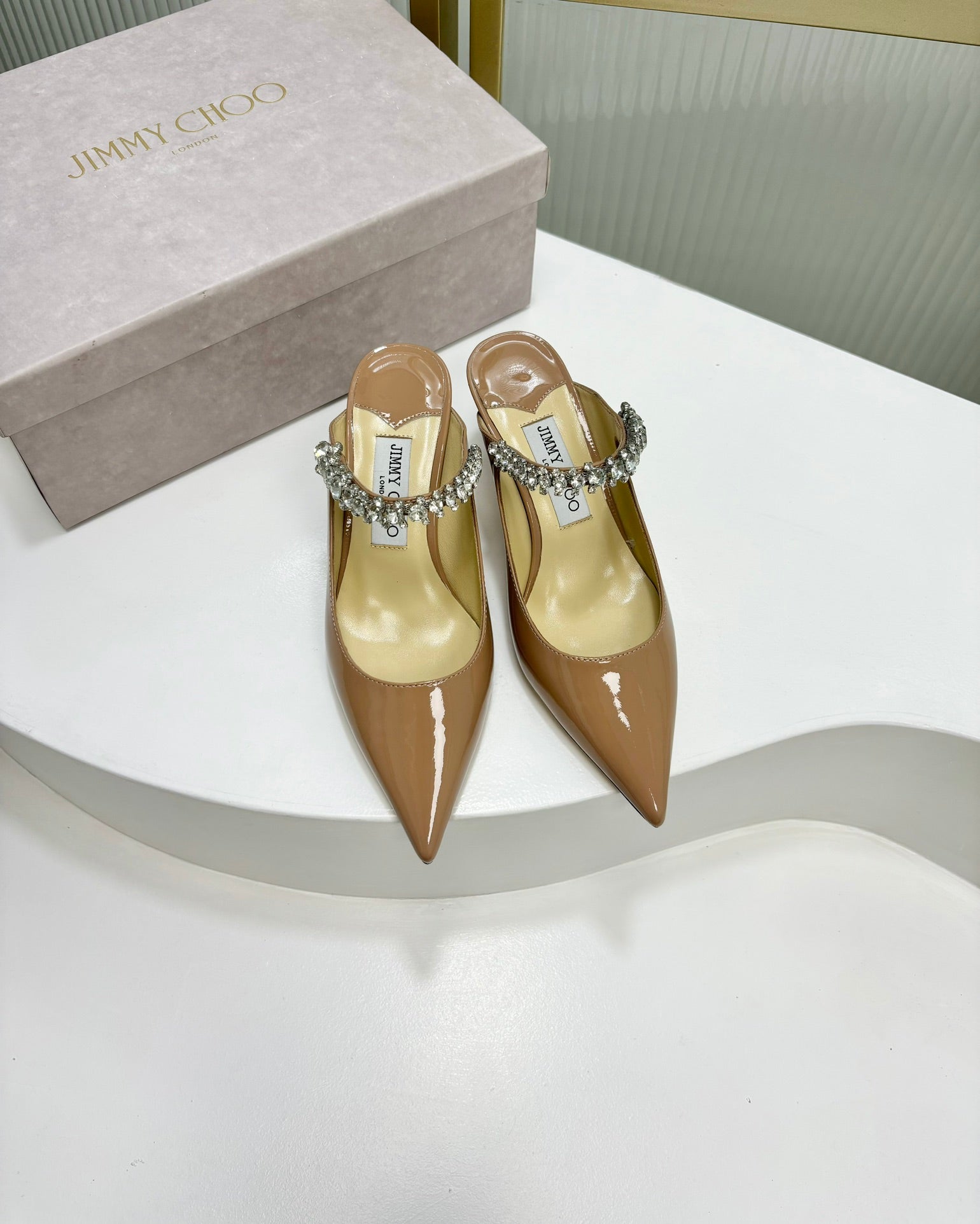 Jimmy Bing 65mm In Dark Beige Glossy Cowhide Mules 587762