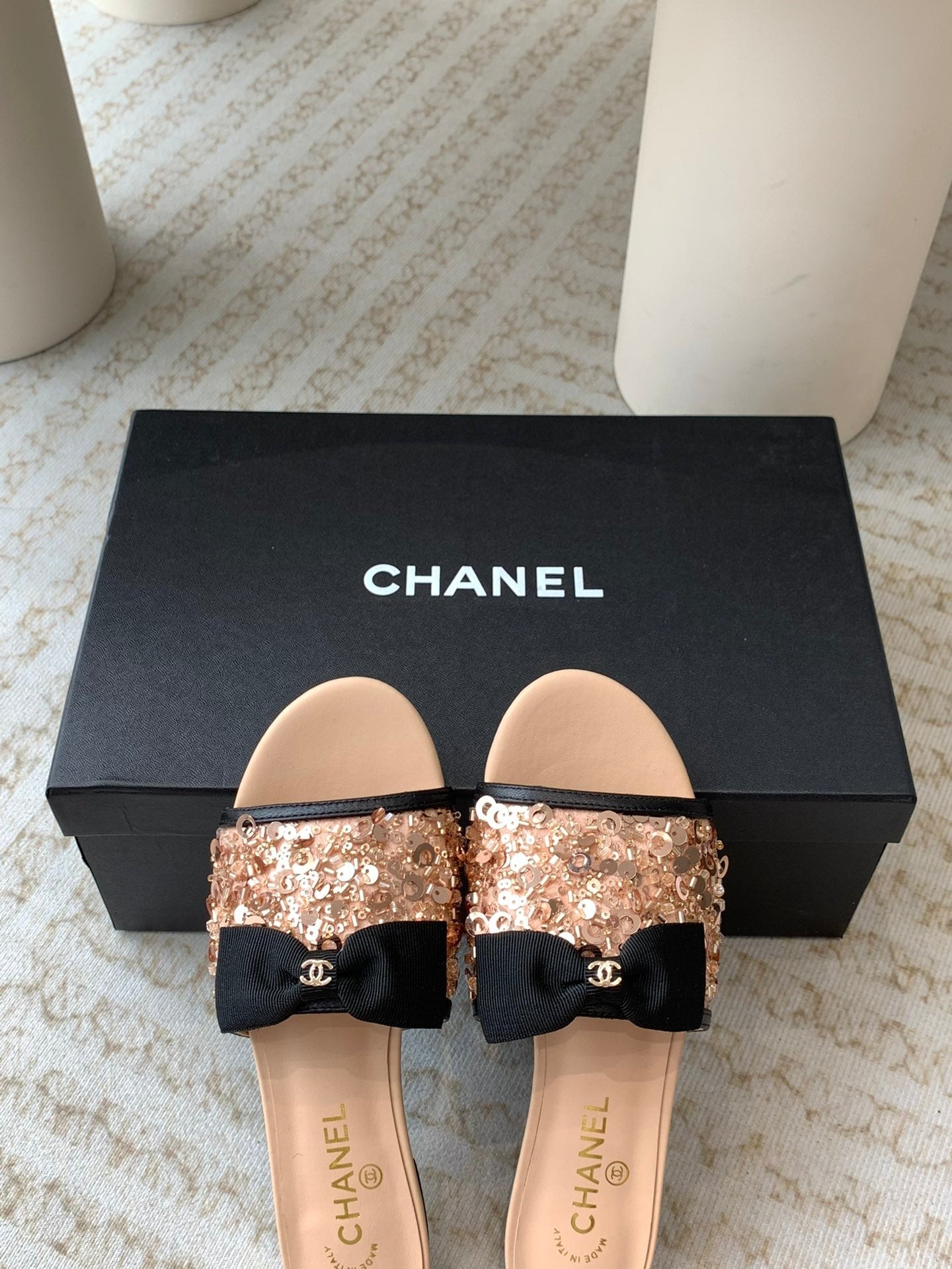 mule sandal beige calfskin glitter sequin