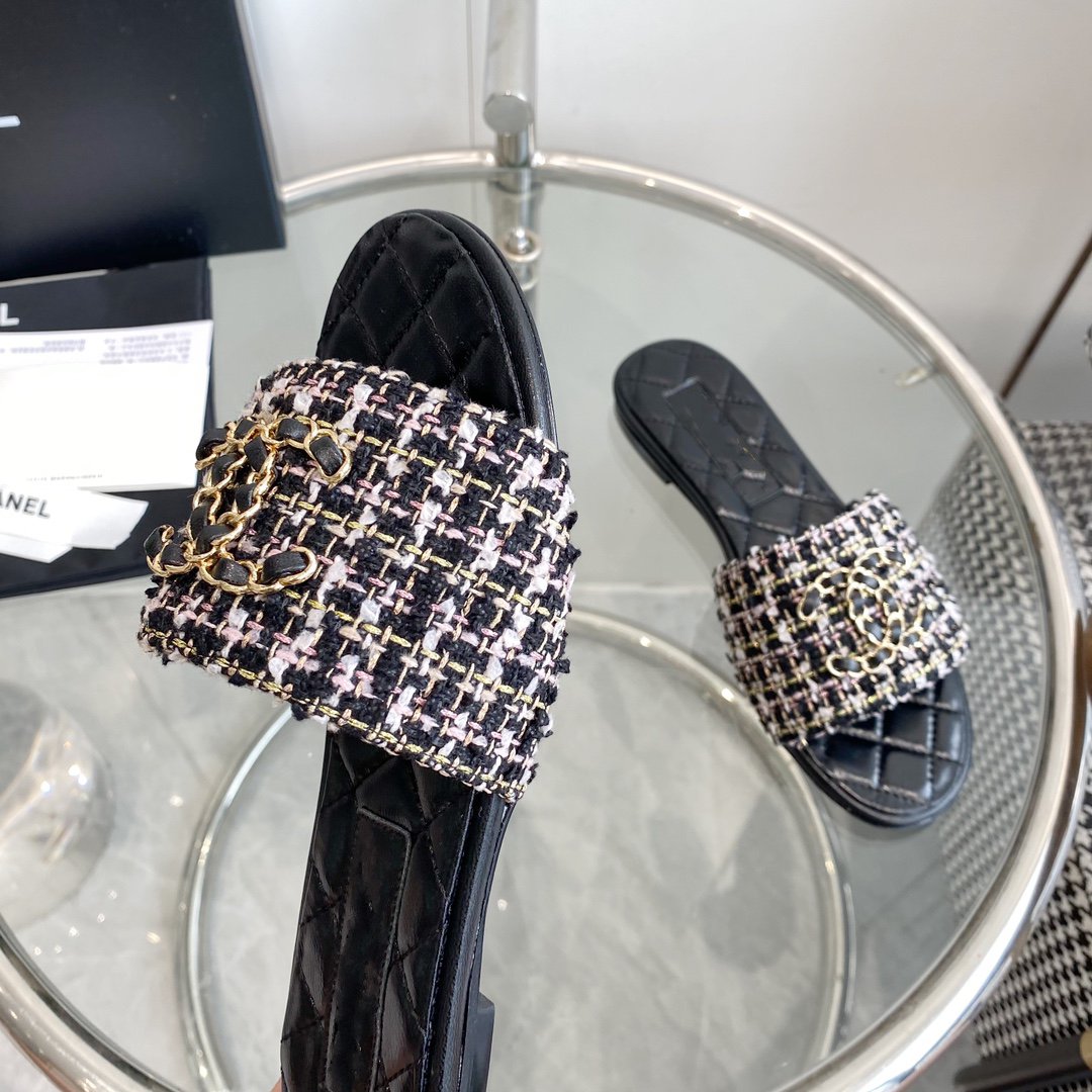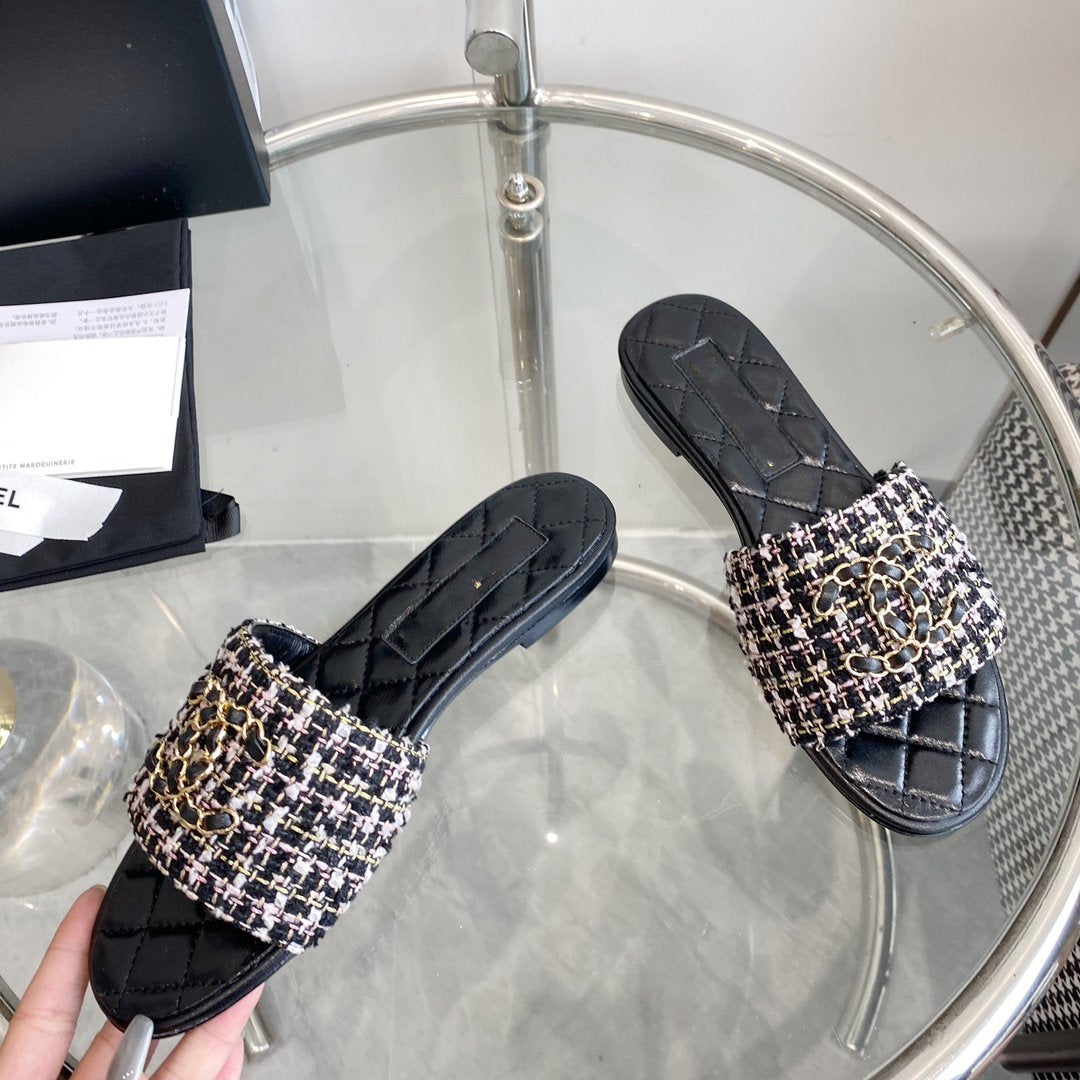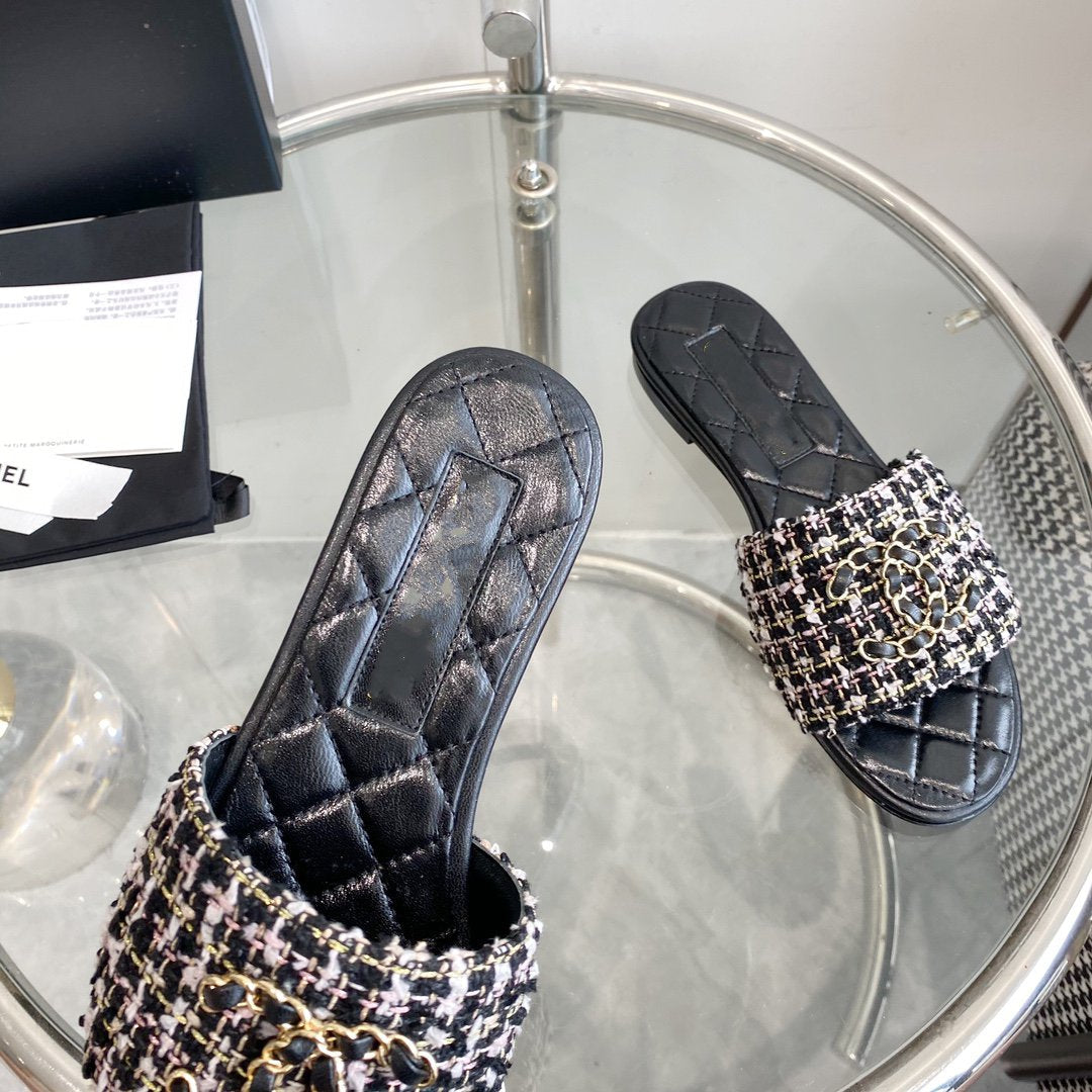 mule sandal black white tweed calfskin