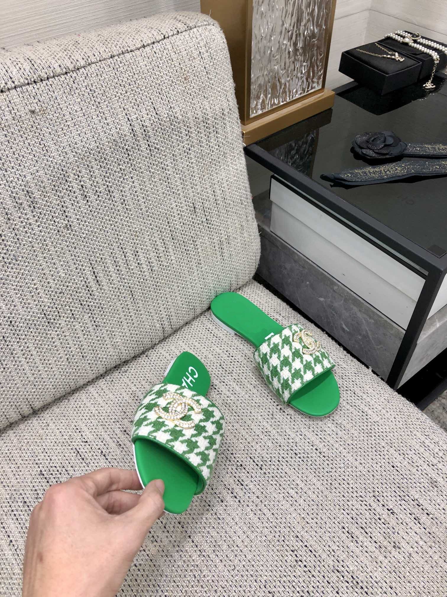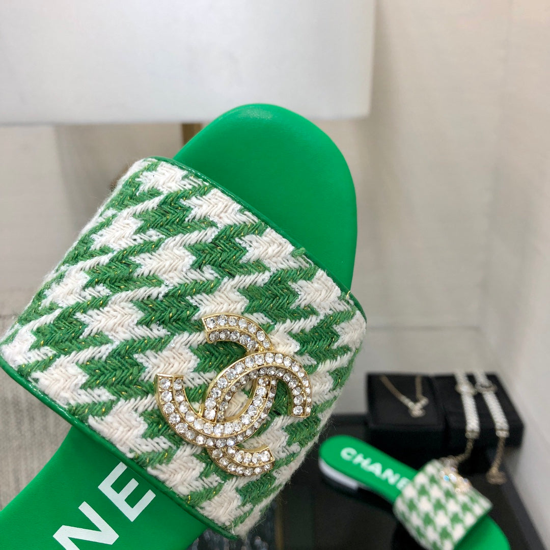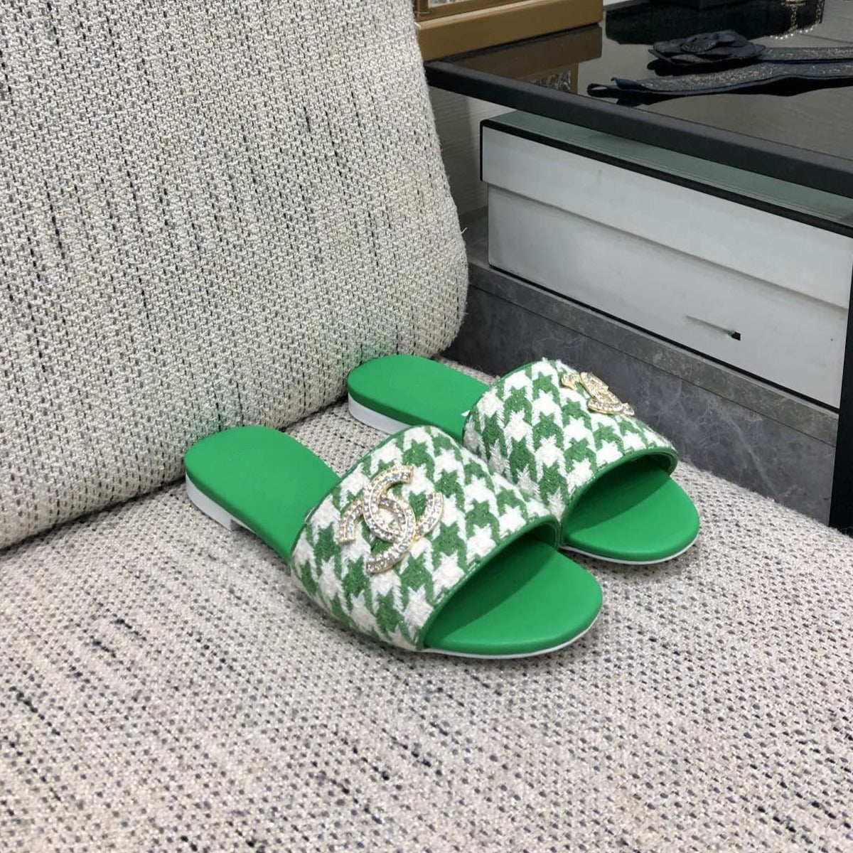 mule sandal green white houndstooth fabric