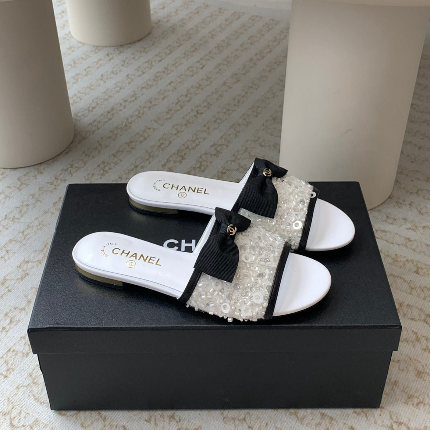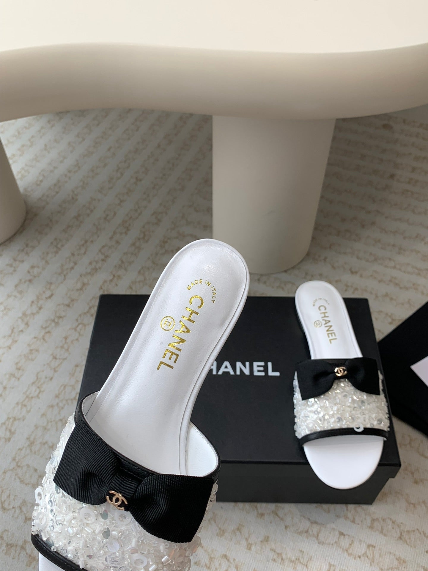 mule sandal white calfskin glitter sequin