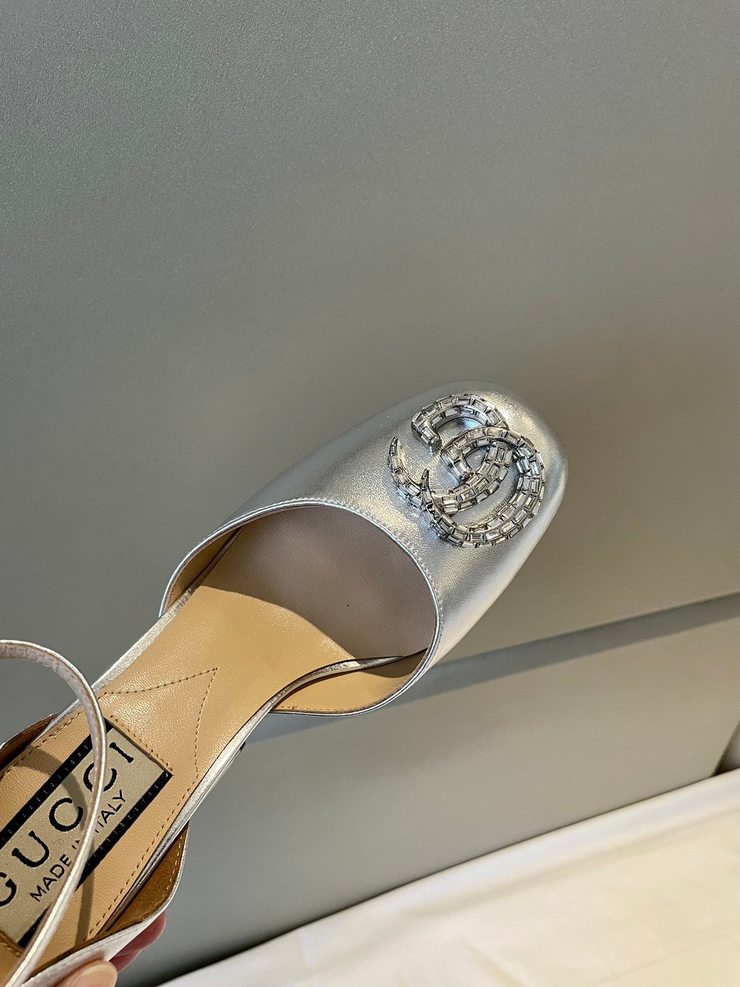 platform pump 12cm with double g silver metalic patent leather
