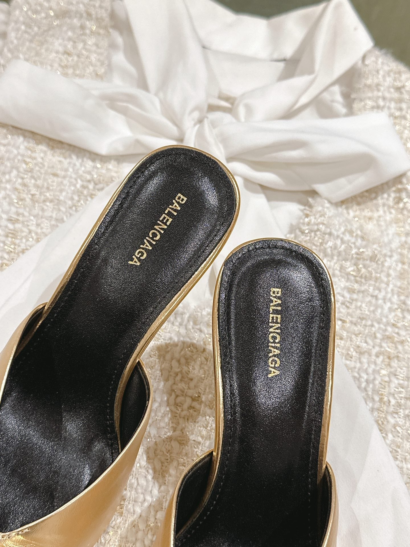POINTED BB GOLD BUCKLE HIGH MULES IN GOLD METALLIC CALFSKIN