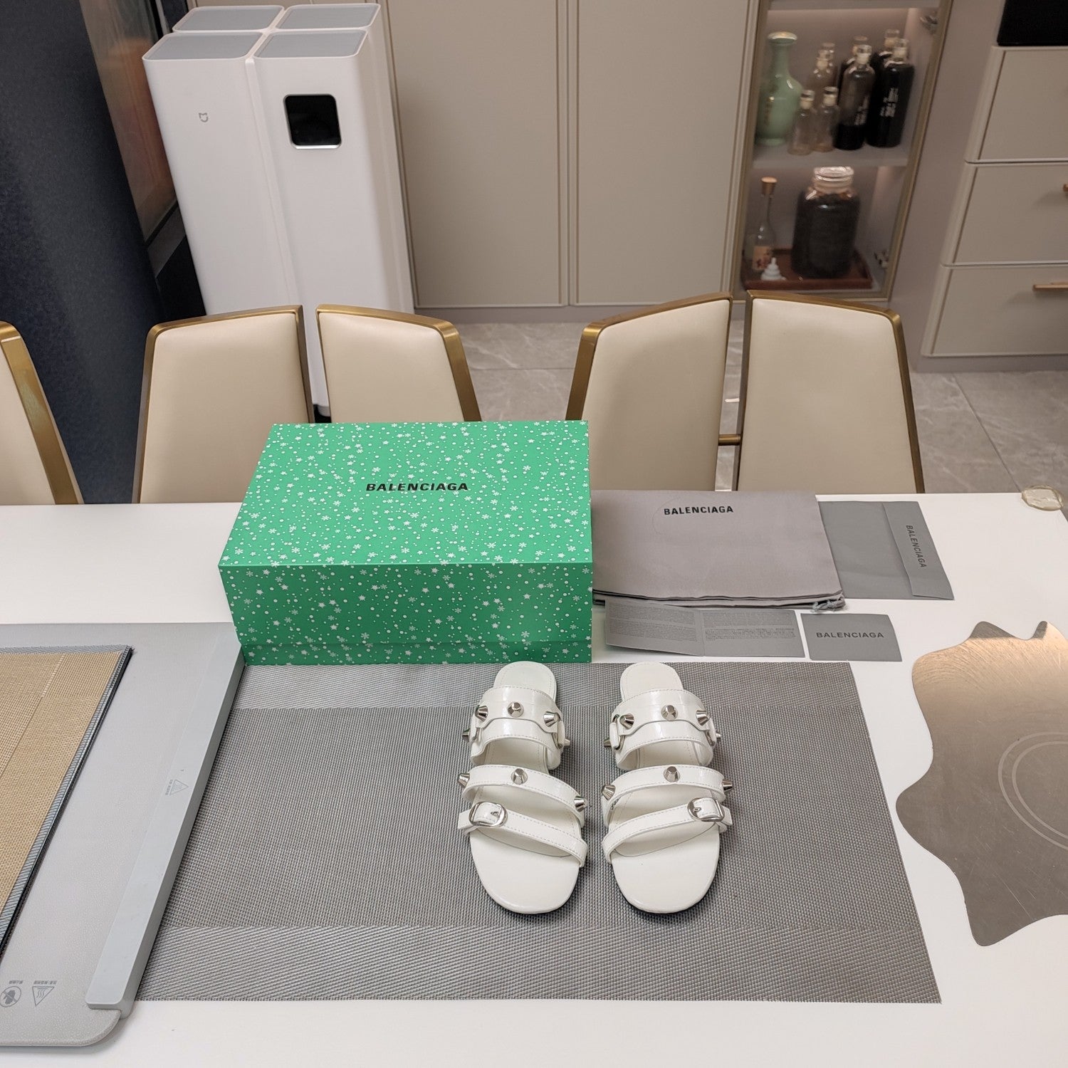 STRAPPY FLAT SANDALS IN WHITE STUDDED WAX-OIL SHEEPSKIN