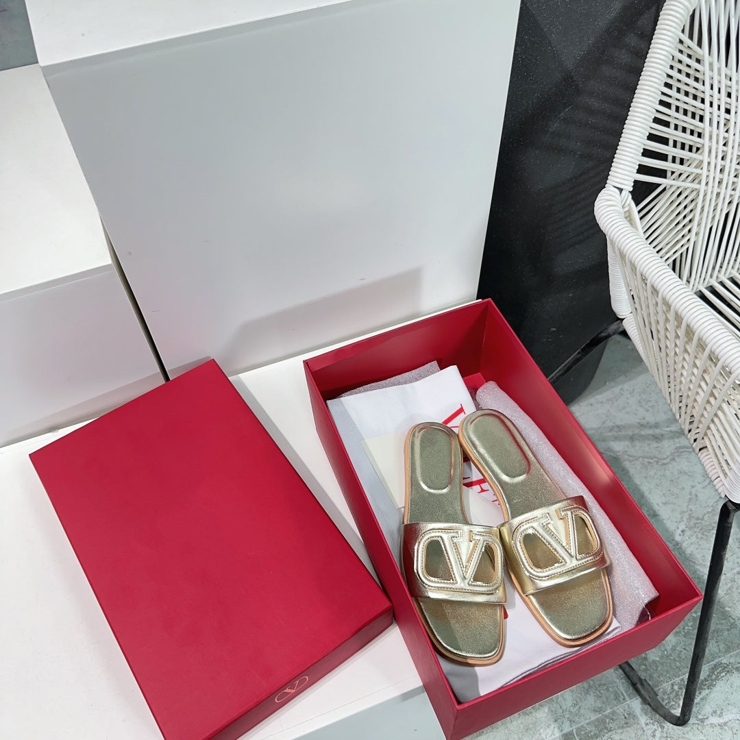 Vlogo Cut-Out Gold Calfskin Slide Sandal