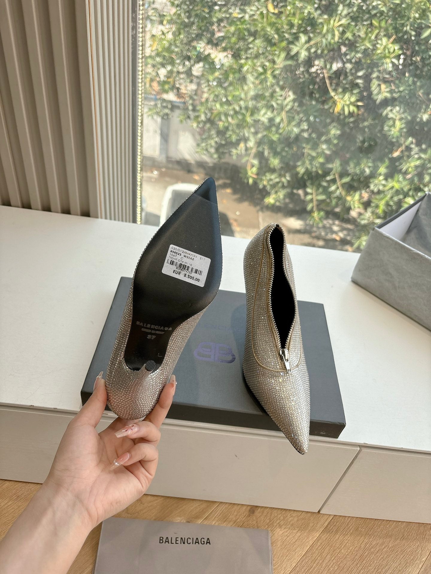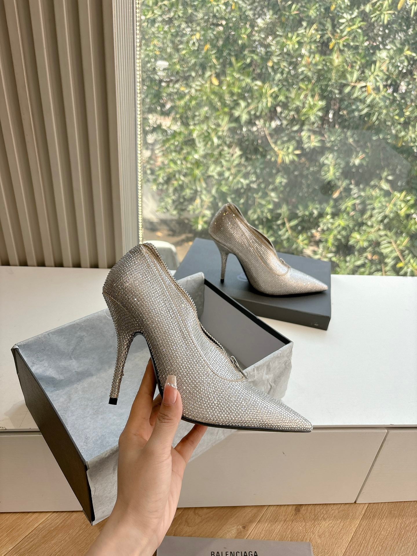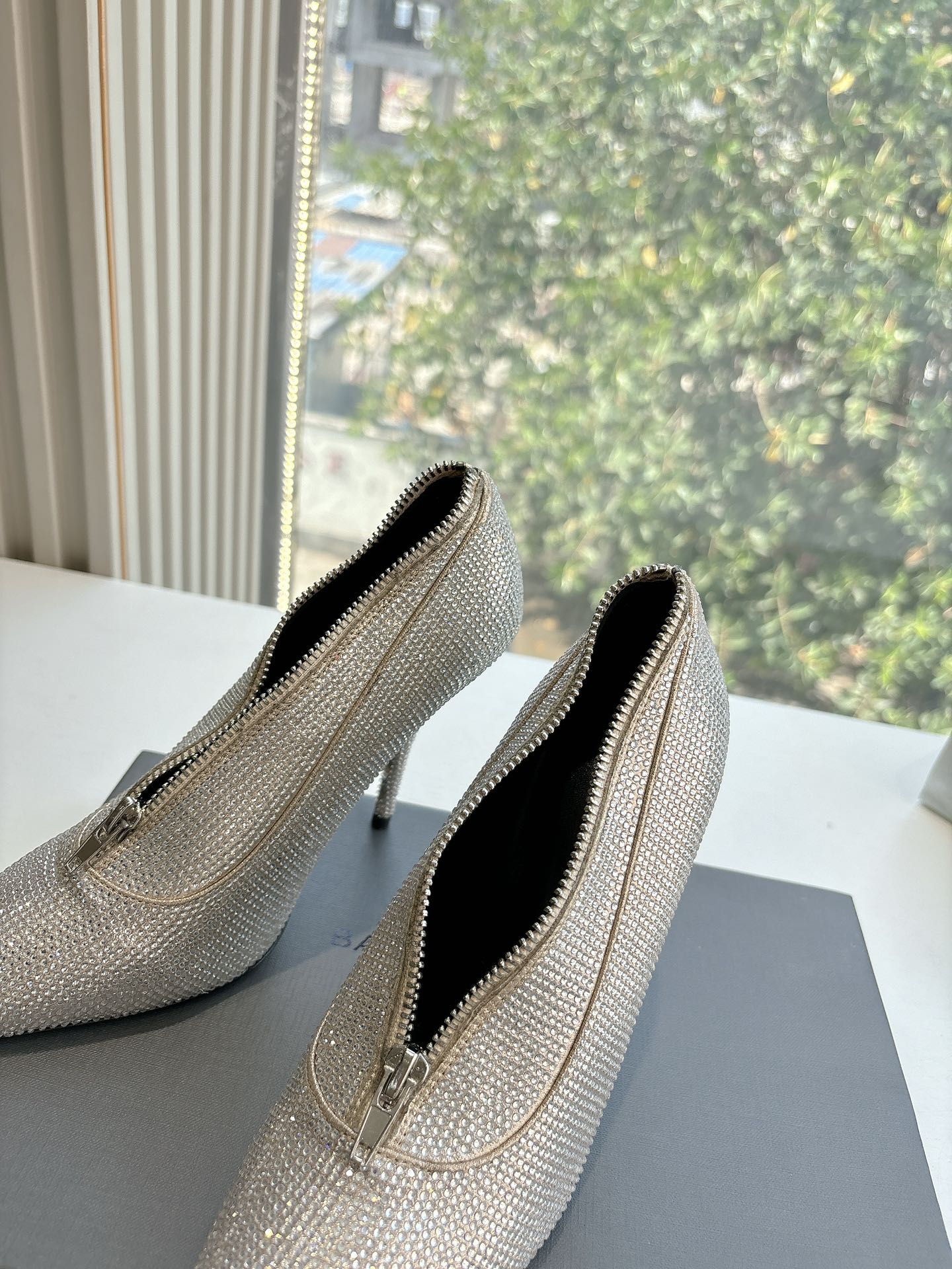 ZIPPER POINTED-TOE HIGH PUMPS IN BEIGE SUEDE ATTACHED SILVER CRYSTAL