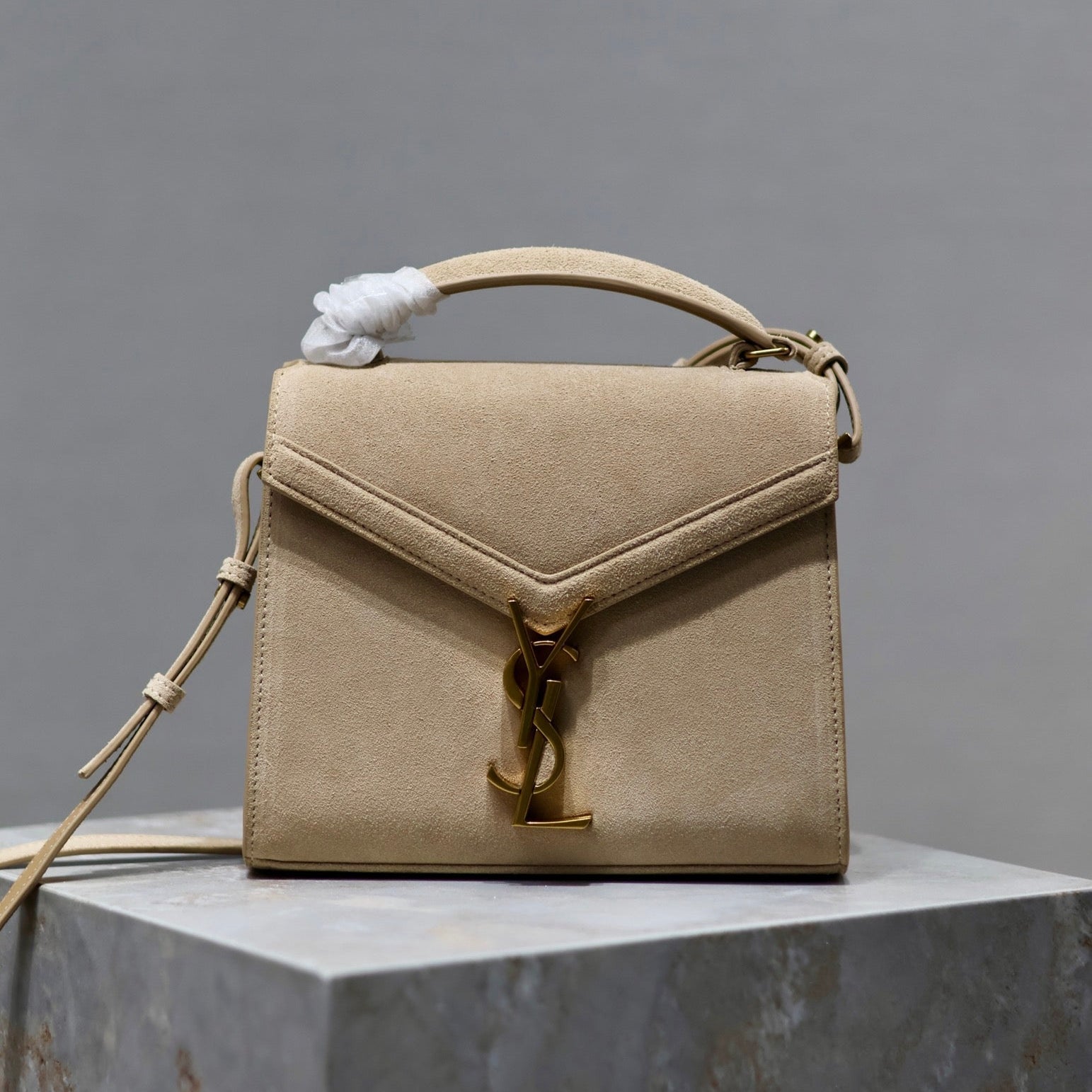 CASSANDRA MINI TOP HANDLE BAG 20 IN BEIGE SUEDE GOLD HARDWARE