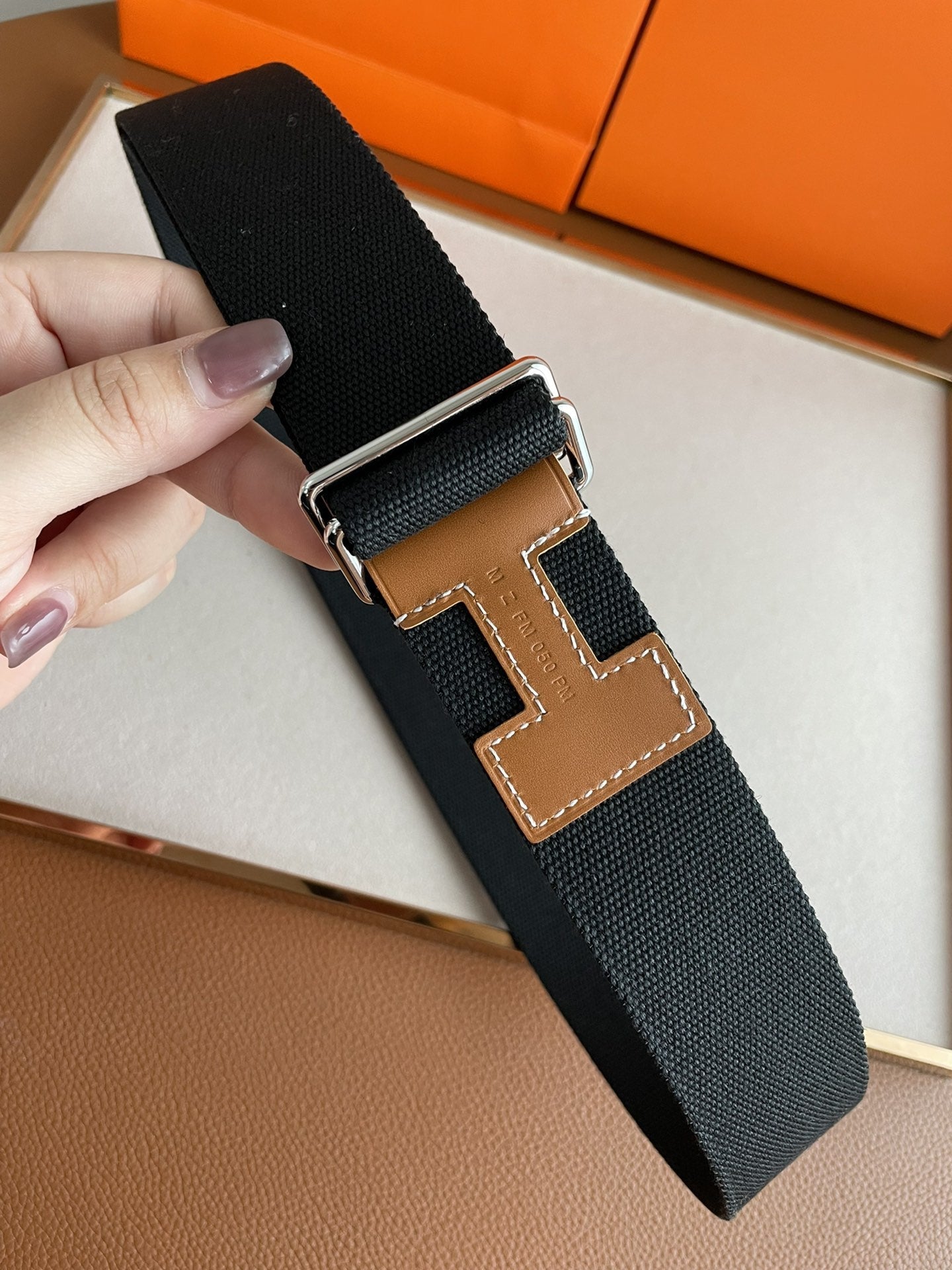 4.0CM BLACK TEXTILE BROWN LEATHER H BELT