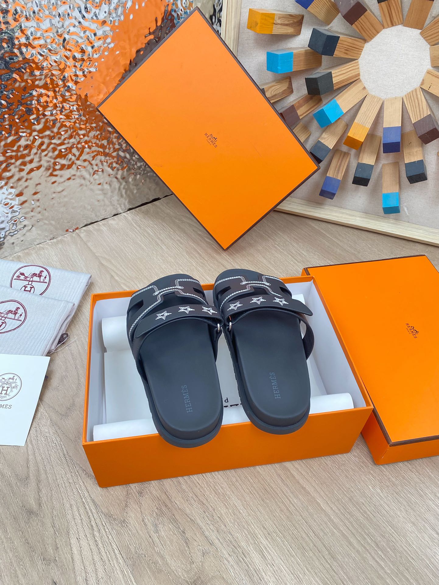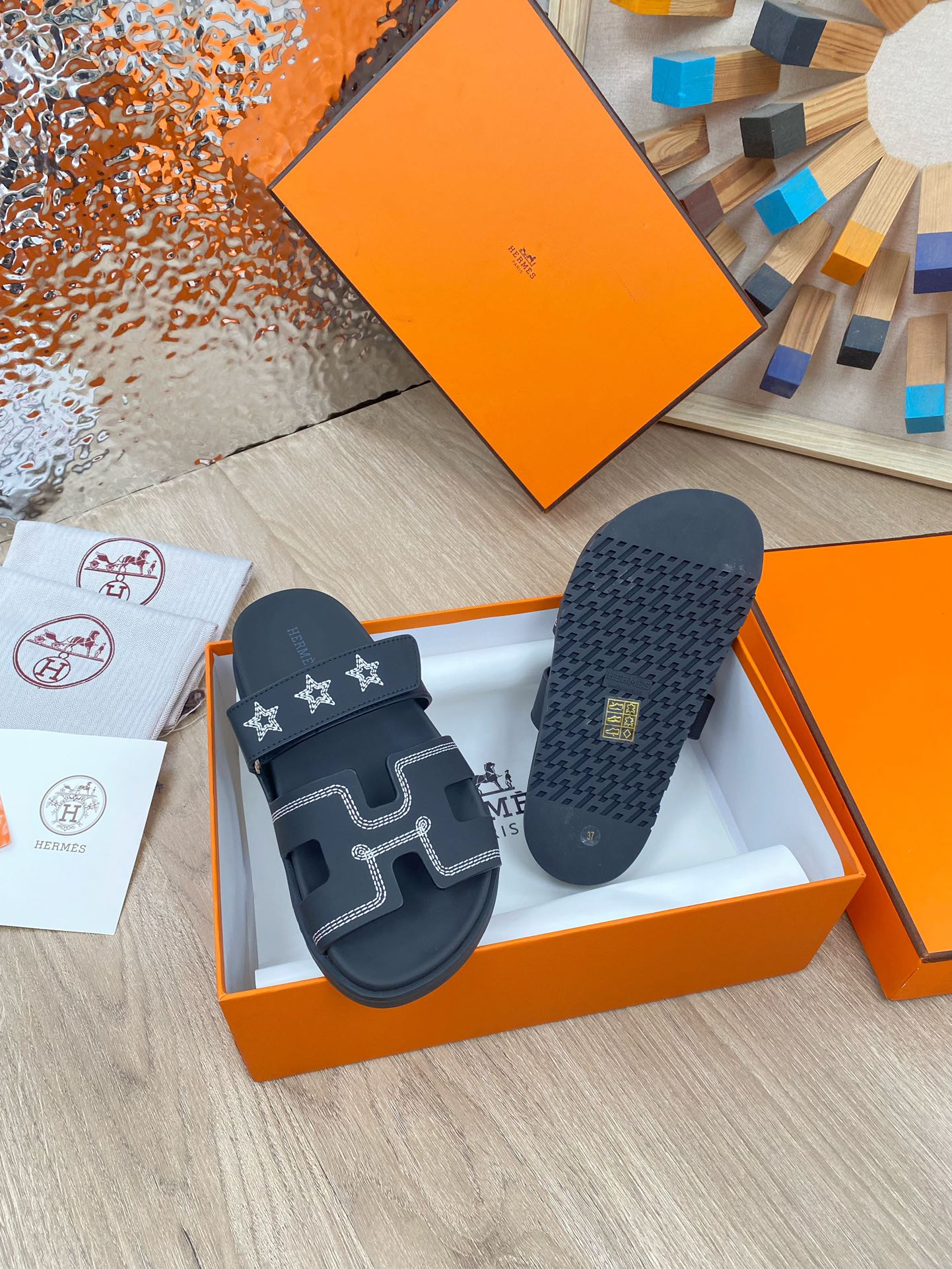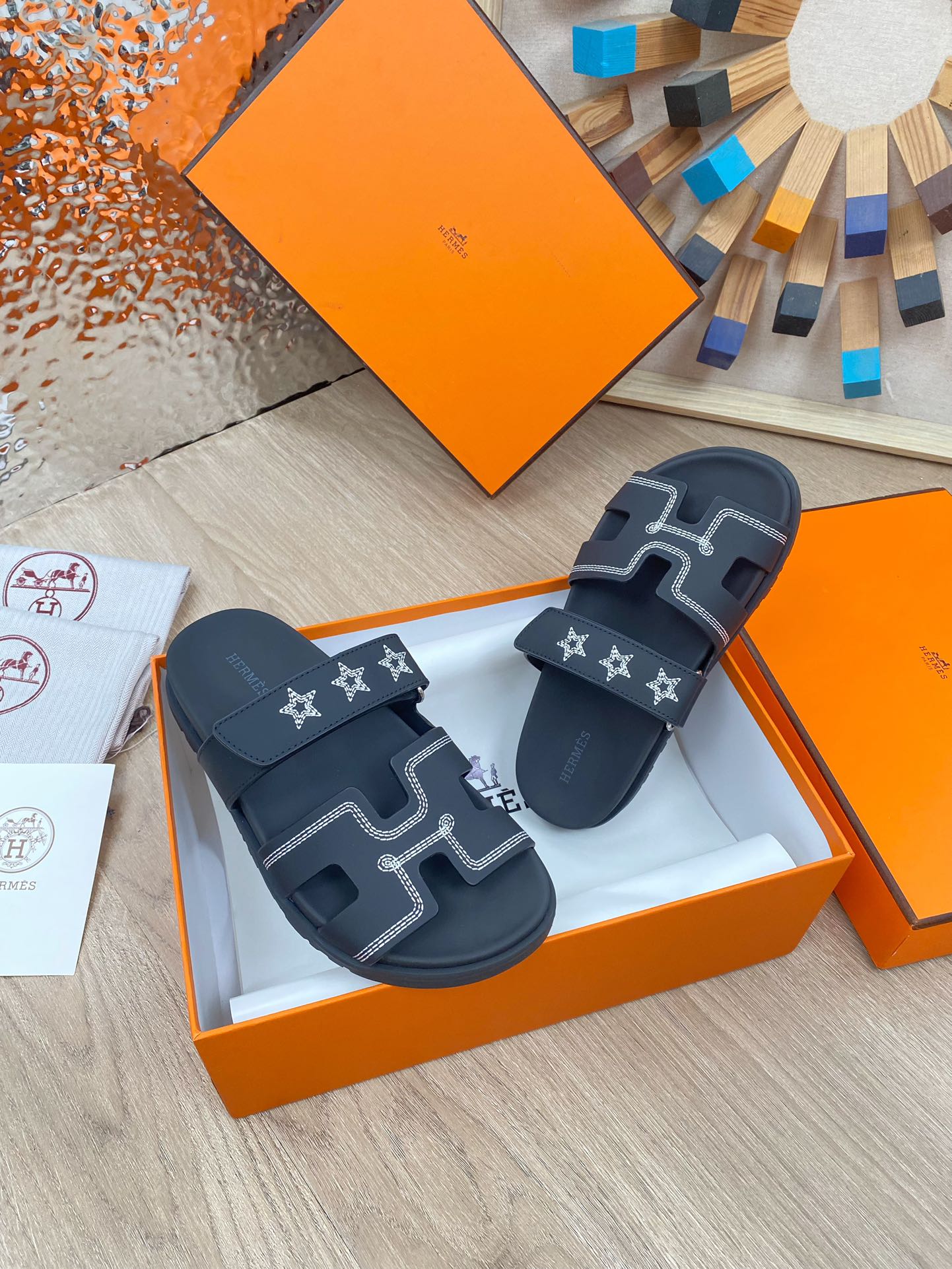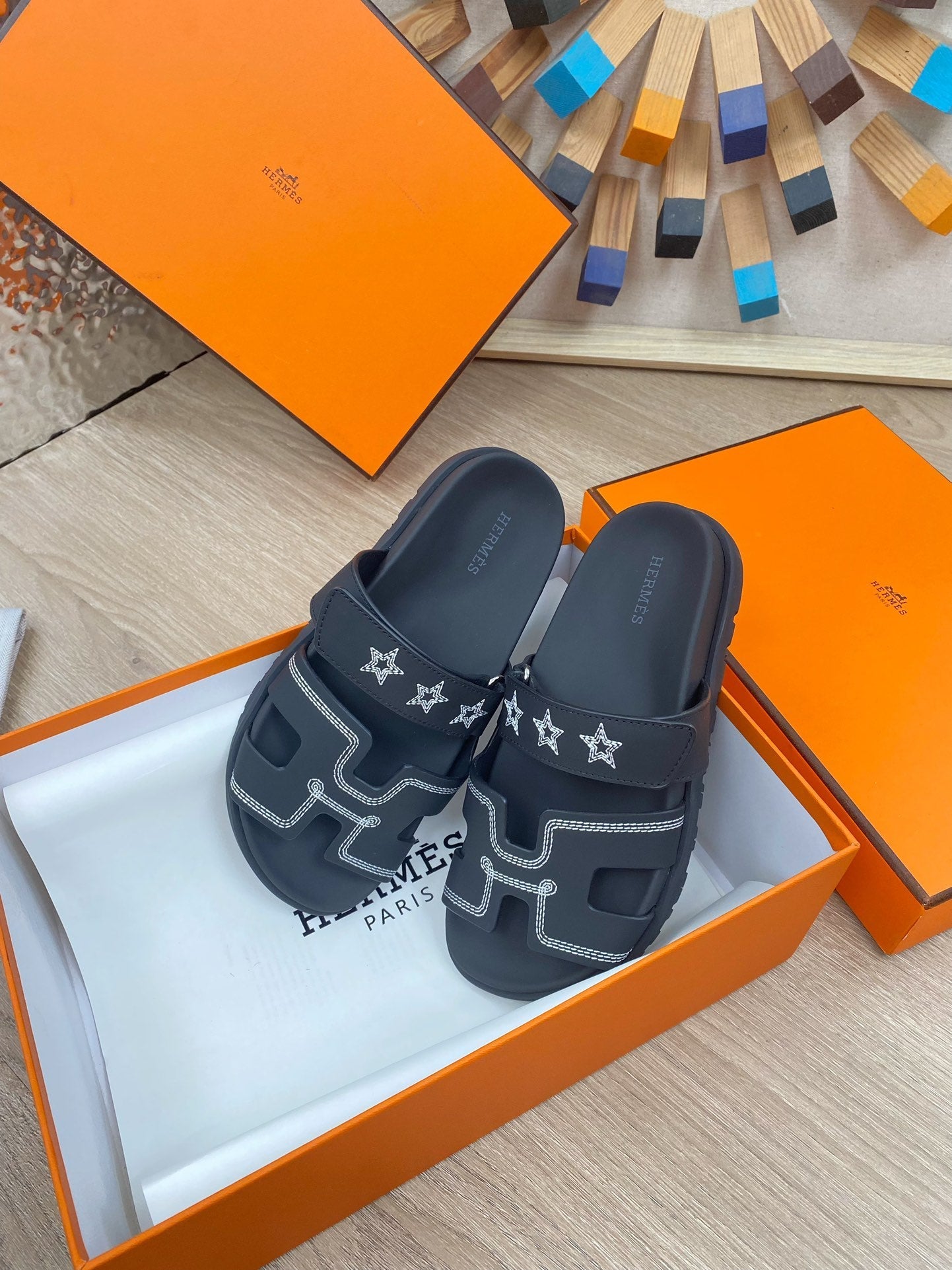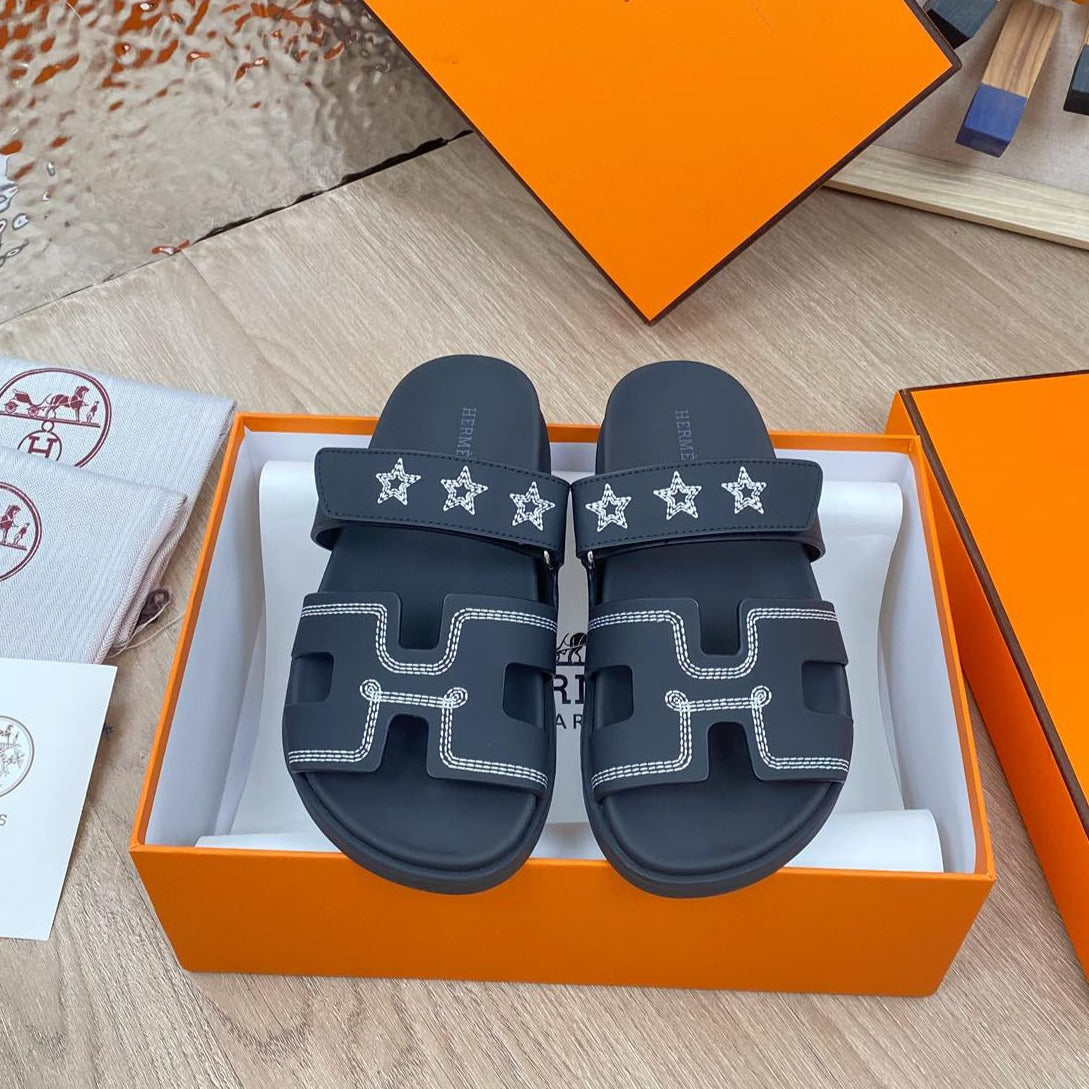 chypre sandal black calfskin white thread embroidered